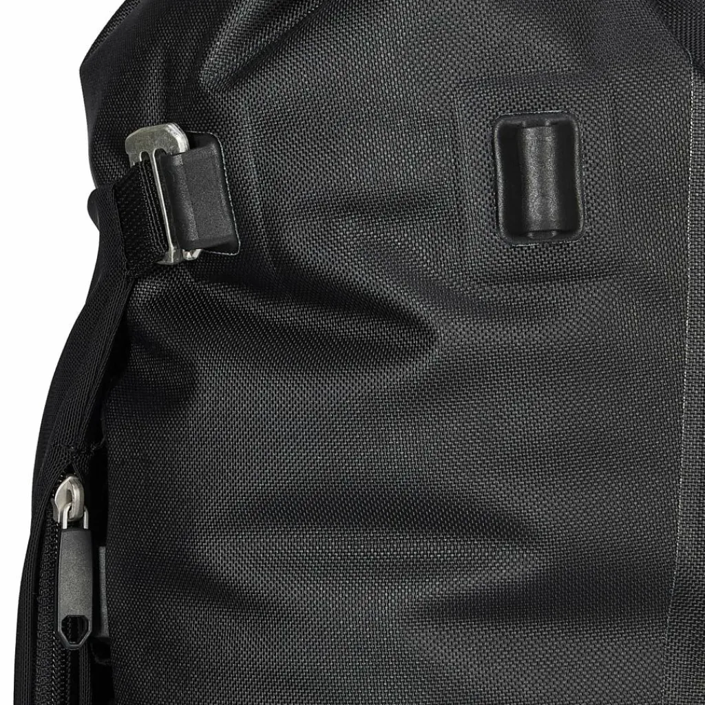 Der flexible Deckel ist mittig an der Seite und am Boden der Vario Lite beweglich angeschlagen. Entweder deckt das Flap also das QuickLock 2.1 System ab, oder aber die Tragegurte. Der Clou: Du kannst es von der einen Seite auf die andere Seite in Sekunden umklappen und fixieren. Fertig ist die Fahrradtasche, respektive der Rucksack! Einfacher kann man samt Tasche gar nicht vom Drahtesel auf Schusters Rappen wechseln. Das Flap schützt jeweils die abgedeckte Seite. Und es bewahrt dich vorm Schmutz, der eventuell vom Hinterrad an deine Packtasche geschleudert wurde.