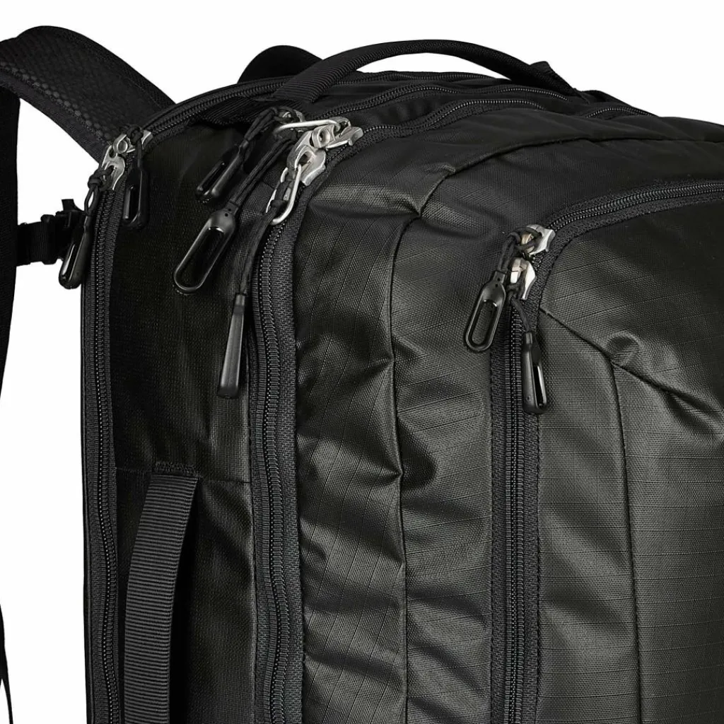 Das mit Carbonat beschichtete Nylon-Hauptmaterial ist stark wasserabweisend und sehr abriebfest und schafft es gleichzeitig, vergleichsweise leicht zu sein. Schmutz und Wasser machen dem Kofferrucksack daher wenig aus, ebenso wie grobes Handling am Flughafen. Die Außen- und Innenmaterialien sind zu 100 % recycelt und das Produkt ist bluesign-zertifiziert.
