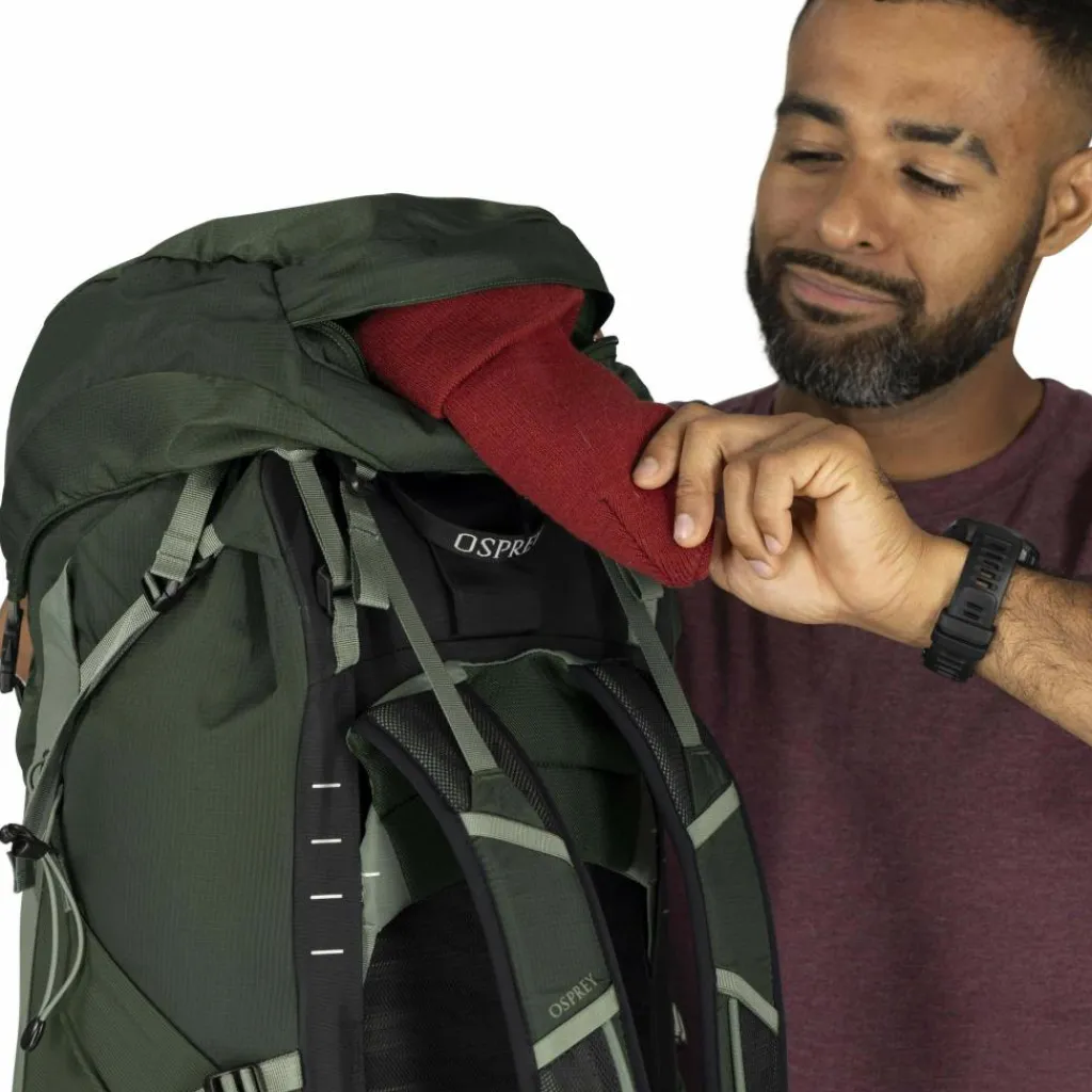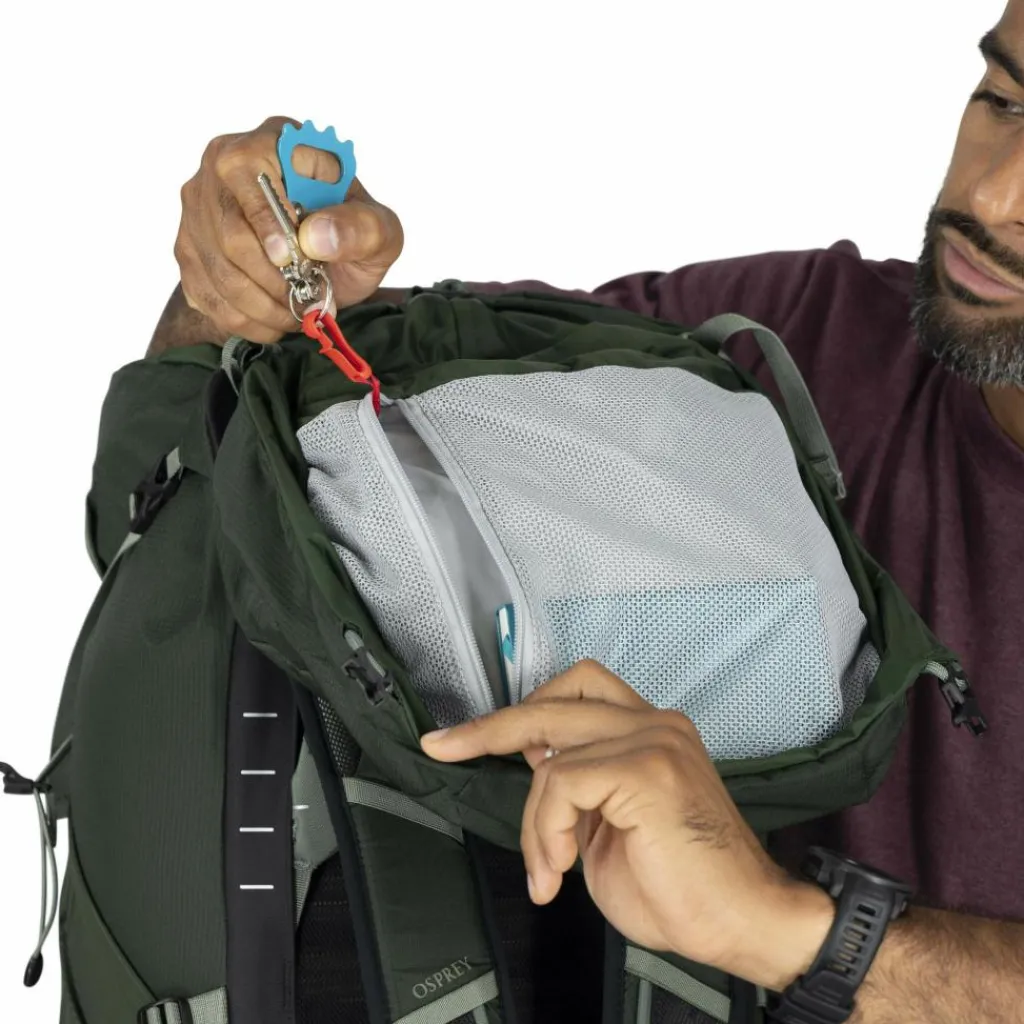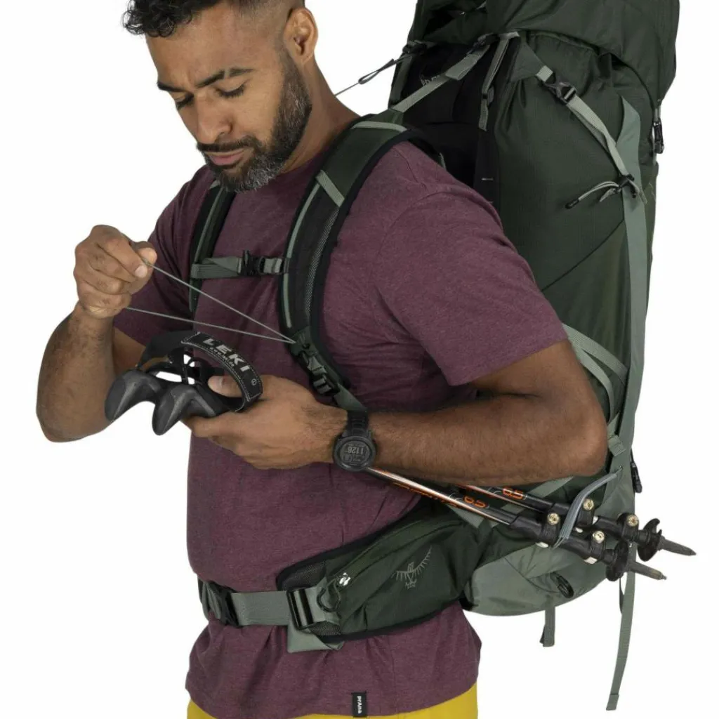 Besonders praktisch ist auch Ospreys Stow-on-the-Go Trekkingstockhalterung, mit der du deine Stöcke auch mit geschultertem Rucksack bequem erreichst. Bonus beim Talon 44: Anders als die kleineren Ableger der Talon-Serie verfügt der Tourenrucksack über ein separates Bodenfach, in dem du einen leichten Schlafsack unterbringen kannst.