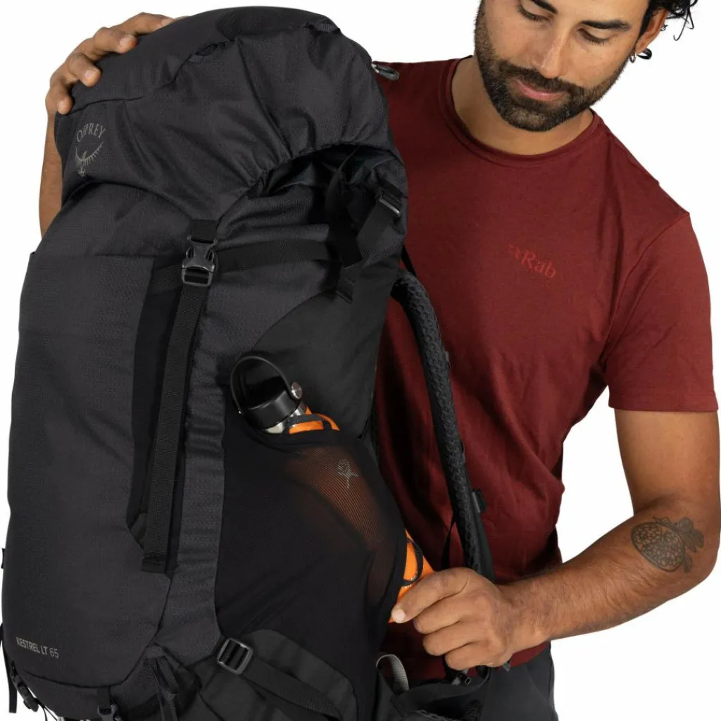 Eine verwindungssteife Rückenplatte und ein leichter Aluminiumrahmen verteilen das Gewicht gleichmäßig und entlasten dadurch deine Schultern. Der körpernahe Sitz hält den Schwerpunkt zudem nah am Rücken, sodass du in unwegsamem Gelände von besserer Lastenkontrolle und Stabilität profitierst. Gleichzeitig lassen 3D-Mesh an den Hüft- und Schultergurten sowie Belüftungskanäle am Rücken Schweiß nach außen entweichen. So trägt sich der Kestrel LT 65 auch auf anstrengenden Touren noch äußerst angenehm.