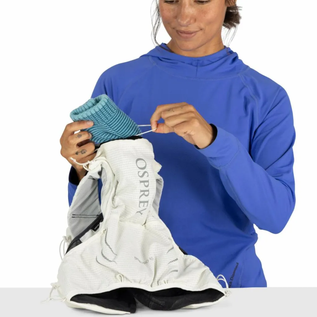 Zwei 500 ml Softflasks sorgen dafür, dass du stets mit Flüssigkeit versorgt bleibst. Für längere Durststrecken auf abgelegenen Trails lässt sich die Dyna 10 Pro zudem mit Ospreys Hydraulics LT 1.5 L Trinkblase (optional erhältlich) bestücken und das Trinkvolumen dadurch auf satte 2,5 L erweitern. Für Energieriegel oder die Stirnlampe gibt es mehrere Steckfächer und auch das Smartphone ist dank zweier RV-Fächer auf der Brust immer griffbereit. Deine Regenjacke kannst du zudem im elastischen Steckfach am Rücken unterbringen.