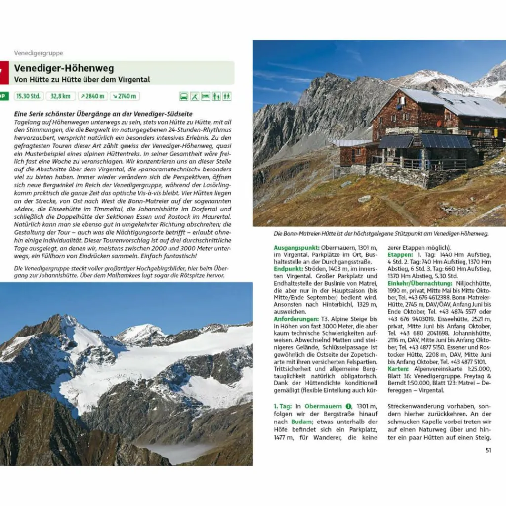 Jede Wanderung wird mit einer zuverlässigen Wegbeschreibung, einem Kartenausschnitt mit eingezeichnetem Routenverlauf und einem aussagekräftigen Höhenprofil vorgestellt. GPS-Tracks zum Download erleichtern die Orientierung unterwegs. Dank vorgestellter Varianten können Touren kombiniert, verkürzt oder auch vereinfacht werden. Tipps zu Einkehr und Übernachtung machen die Infos komplett. Nicht zuletzt die zahlreichen Fotos von der beeindruckenden Bergwelt Osttirols machen Lust, sofort den Rucksack zu packen.