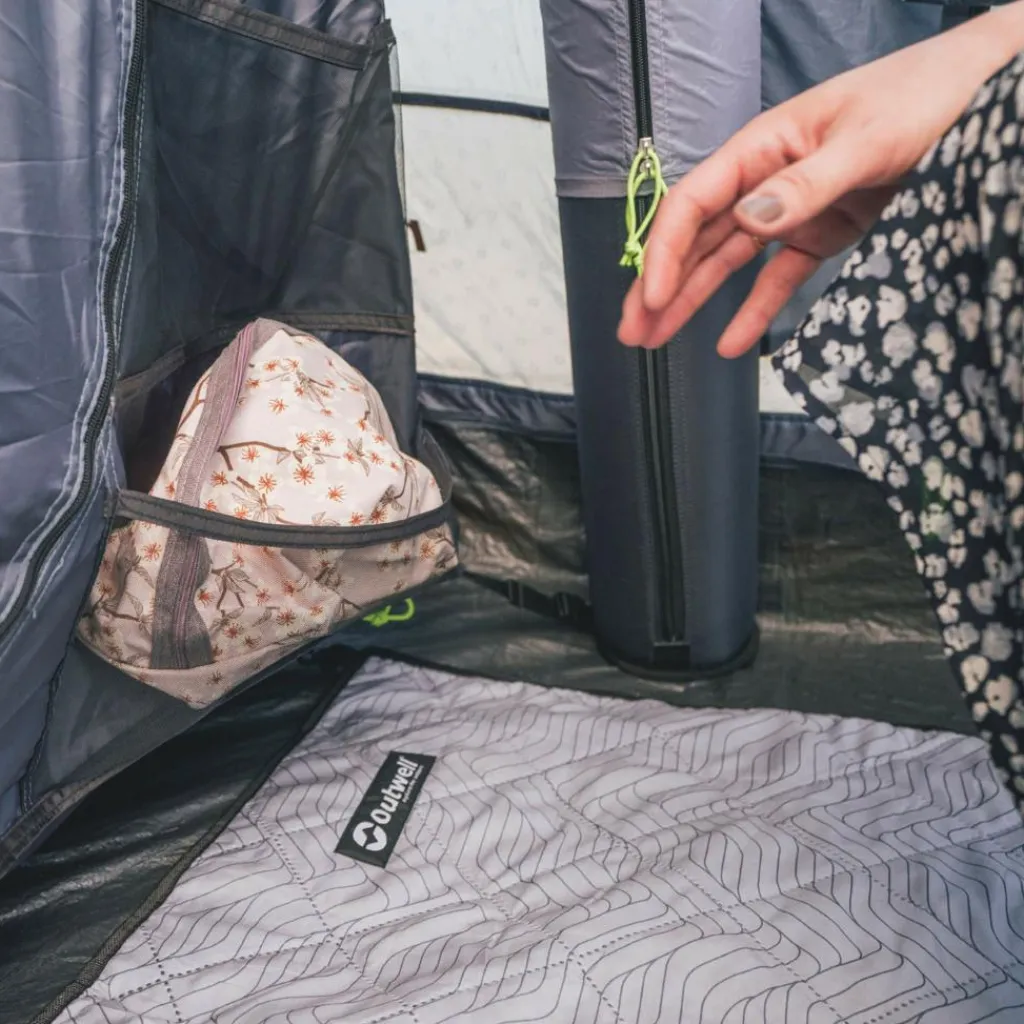 Auch an dunklen Regentagen weiß das Tunnelzelt zu überzeugen, denn ein eingenähter Zeltboden sorgt für trockene Füße in der Apsis, während große, wasserfeste Fenster freien Blick nach draußen bieten. Auf Strom musst du im Zelt ebenfalls nicht verzichten, denn die Apsis verfügt über eine Kabeldurchführung. Und wenn das Wetter Mal richtig ungemütlich wird, steht das Monterey 5 Air dank 14 Abspannleinen und aerodynamischer Konstruktion bis zu einer Windstärke von 9 (75 – 88 km/h) noch stabil.