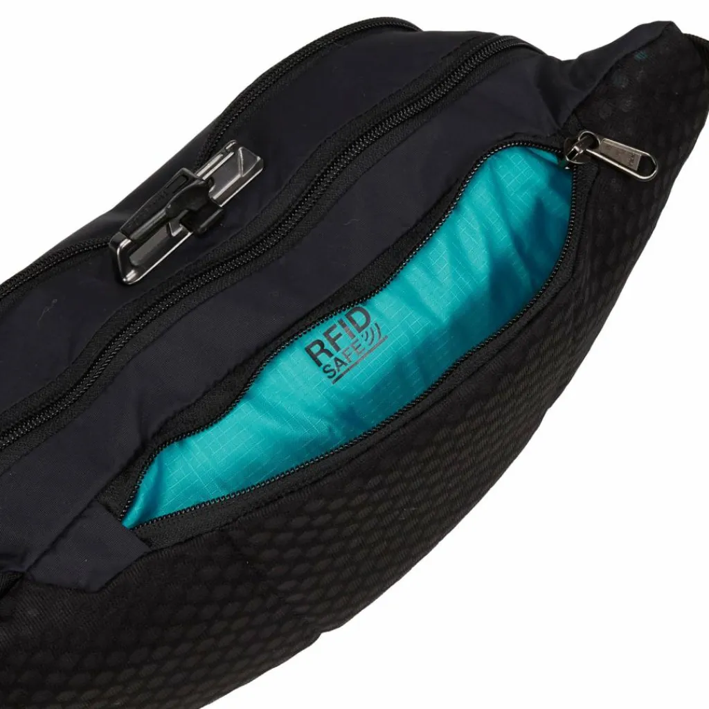 Das ECO Waist Pack gehört zu Pacsafes ECO-Serie, die aus fast 100% recycelten Materialien hergestellt wird und damit besonders nachhaltig ist. Unter anderem werden Econyl-Nylon aus Meeresmüll und Nylonabfällen sowie Polyester aus recycelten Plastikflaschen verwendet.