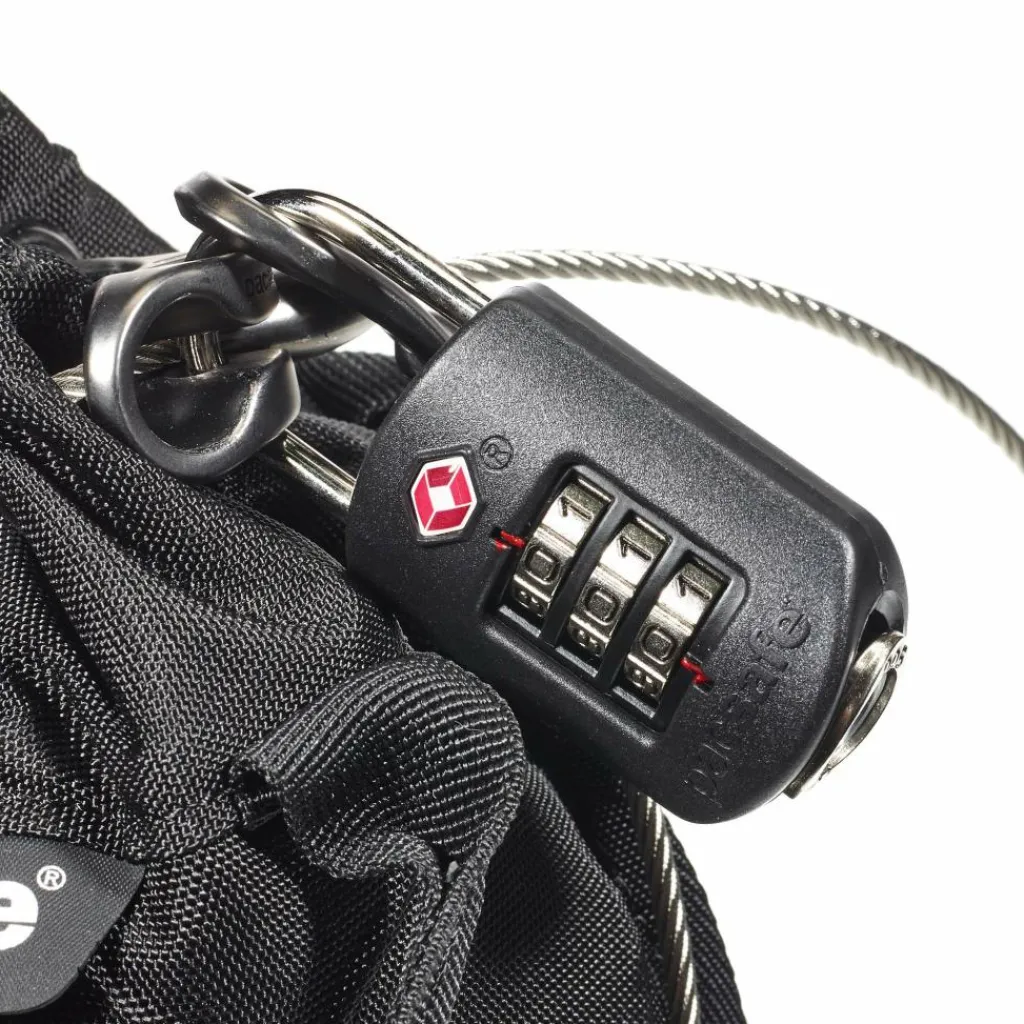 Das schmale Design sorgt dafür, dass der kleine Reisesafe in jede Tasche passt. Mittels dem Drahtseil kann der Travelsafe 3 L an feste Objekte angeschlossen werden.