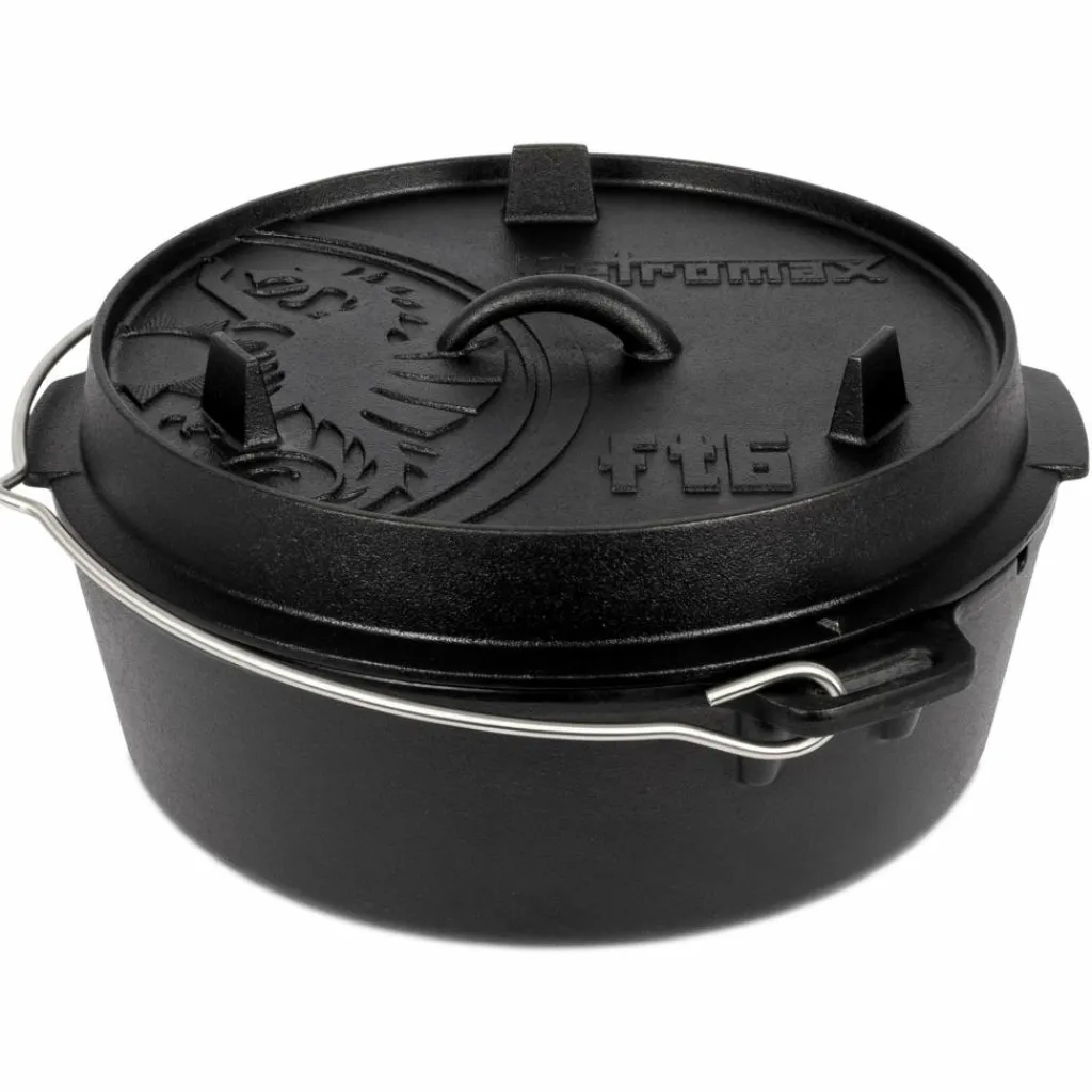 Schwerer Dutch Oven mit glattem Boden zur Zubereitung von Speisen über dem Lagerfeuer oder im Ofen. Er eignet sich zum Garen ebenso wie für leckere Eintöpfe, Suppen, Fleisch und Gemüse.