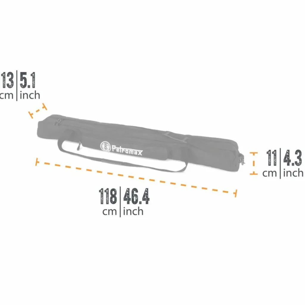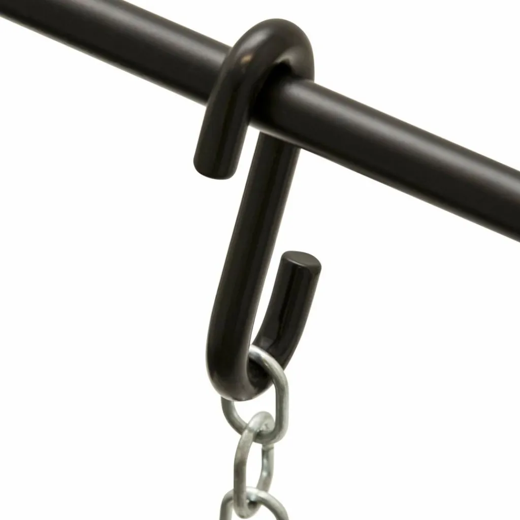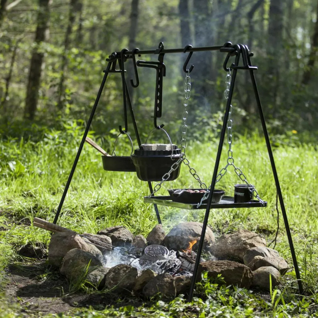 Das Gestell aus pulverbeschichtetem Stahl nimmt zerlegt wenig Platz ein, steht zusammengesteckt jedoch stabil über dem Feuer. An der 115 cm langen Querstange kannst du Töpfe nach Bedarf positionieren und so die Hitze optimal nutzen.