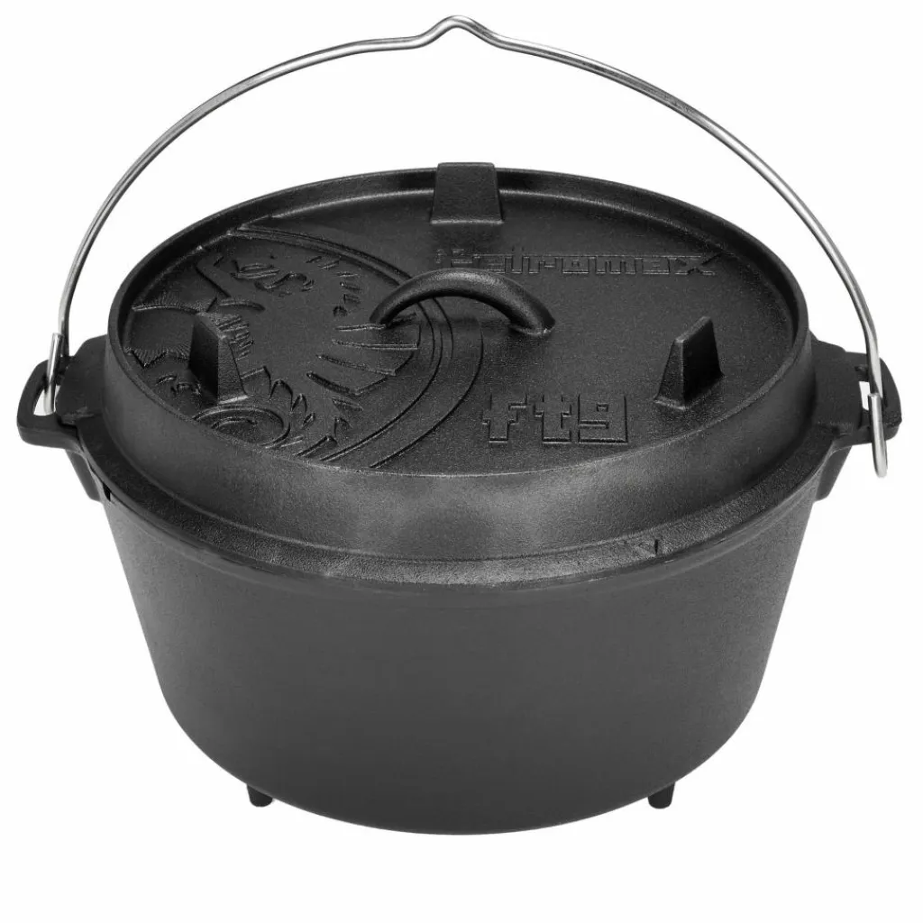 Schwerer Dutch Oven mit Standfüßen zur Zubereitung von Speisen über dem Lagerfeuer oder im Ofen. Er eignet sich zum Garen ebenso wie für leckere Eintöpfe, Suppen, Fleisch und Gemüse.
