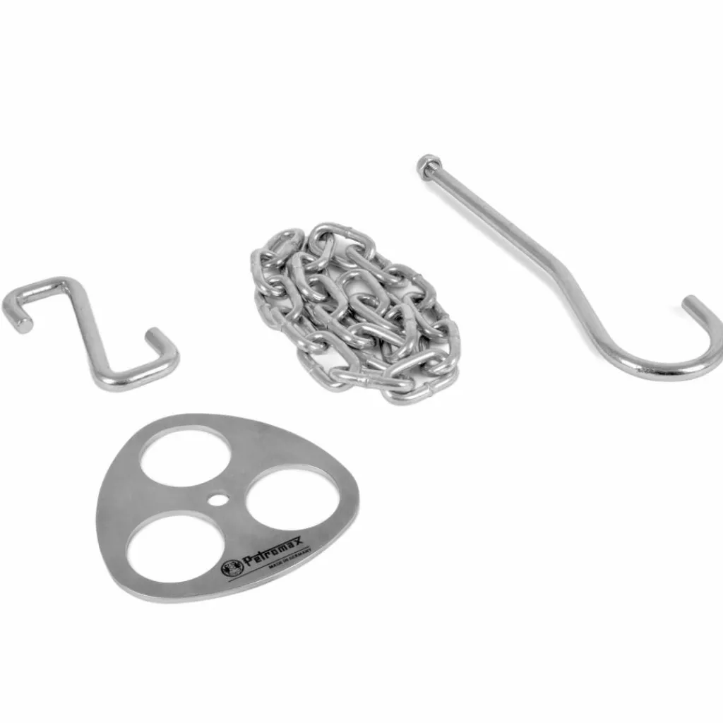 Nach dem Aufstellen kann die im Lieferumfang enthaltene Kette in den Haken gehängt werden, wodurch der Kessel in der Höhe variiert werden kann.