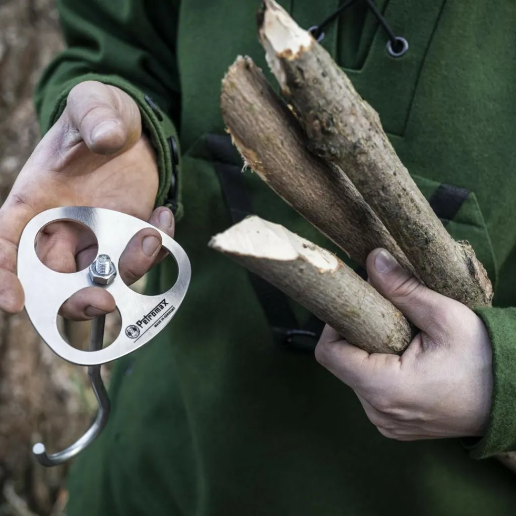 Mit diesem nützlichen Ring bastelst du dir im Handumdrehen ein Dreibein. Dafür schiebst du einfach Äste in gewünschter Länge durch die Öffnungen und stellst diese auf. Inkl. längenverstellbarer Kette.