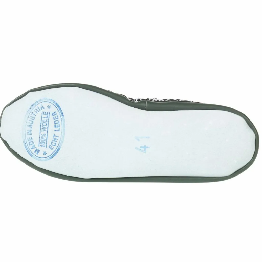 Nostalgischer Hüttenschuh für stilvolle Après Ski-Abende. Warm, weich und stilecht mit umkettelter Zierbordüre und geketteltem Knöchelrand.