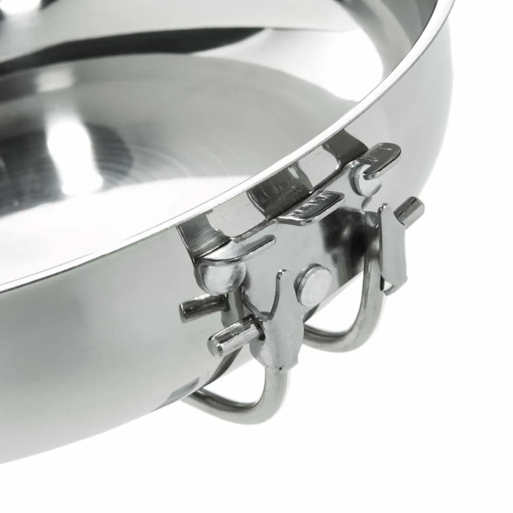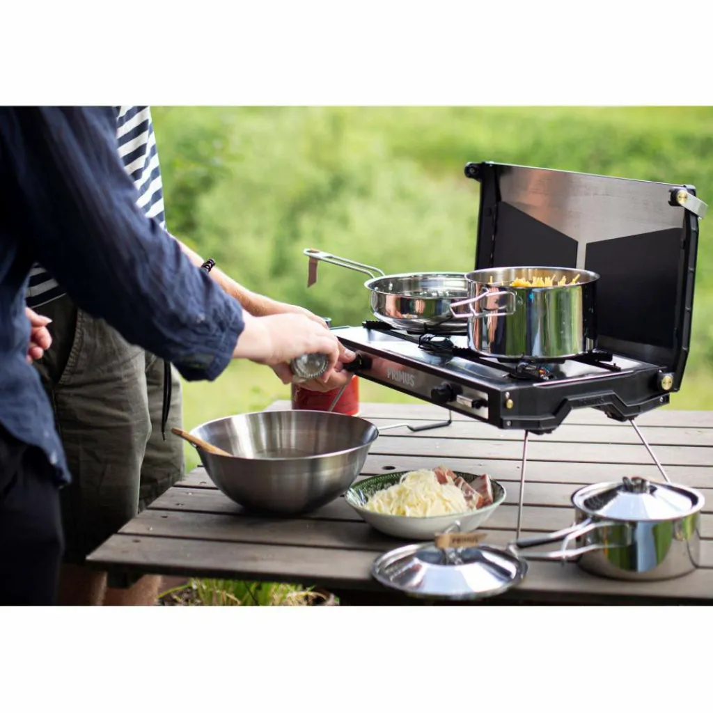 Dank einklappbarer Griffe aus Edelstahl und der Möglichkeit, alles ineinander zu stapeln, ist das Set auch moderat im Packmaß. Inklusive Aufbewahrungsbeutel.