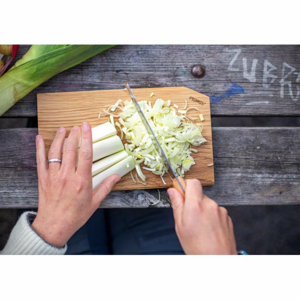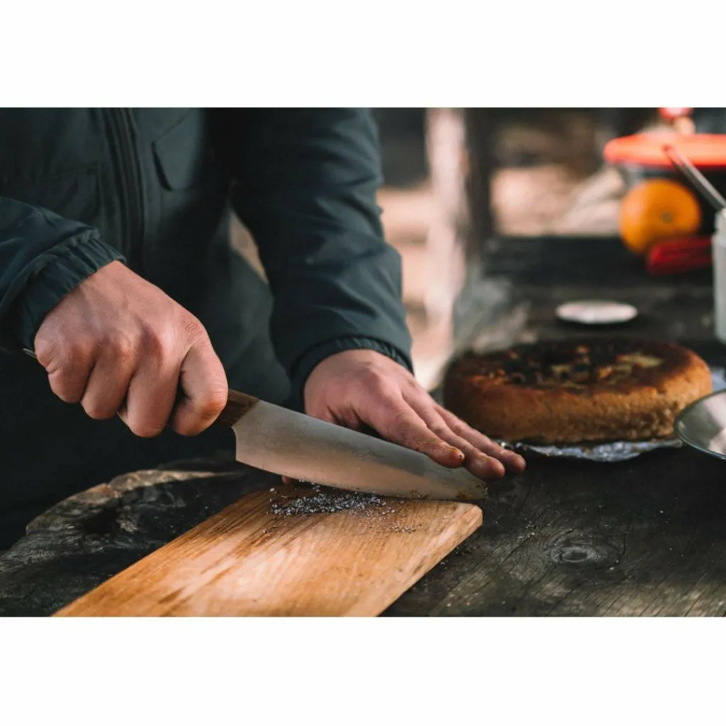 Die breite Klinge ist 15 cm lang, scharf und flexibel. Ideal, um sowohl Fleisch als auch Gemüse ohne große Mühen kleinzuschneiden. Konsequenterweise ist der Griff des Messers auch aus hartem Eichenholz.