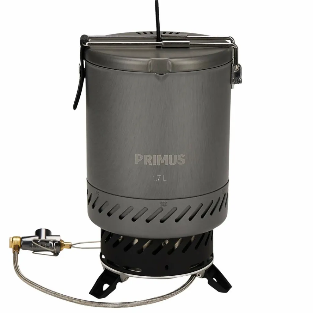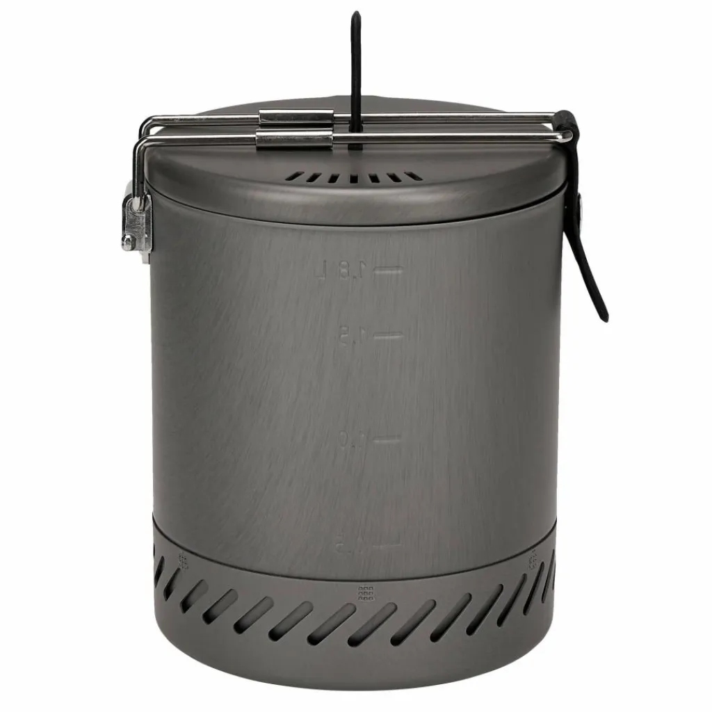 Der Brenner besitzt drei klappbare Beine, die für einen niedrigen Schwerpunkt und sicheren Stand sorgen. Seitlich des hartanodisierten Topfes befindet sich ein Wärmetauscher, der vorbeiströmende Wärme aufnimmt und die zur Verfügung stehende Hitze effizient an den Topf weitergibt. Ausgestattet ist er zudem mit einem Ausgießer, einem Klappgriff mit Isolierung und einem Deckel mit Siebfunktion zum Abgießen überschüssigen Wassers.