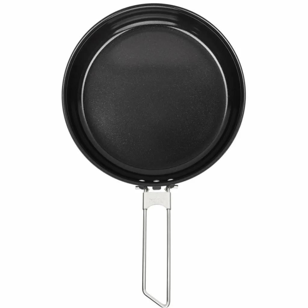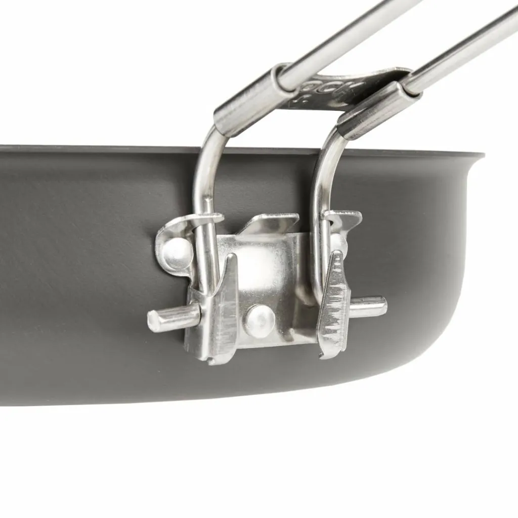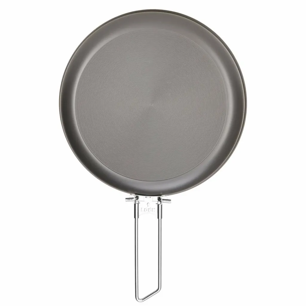 Leichte Pfanne aus hartanodisiertem Aluminium und kratzfester Keramik-Antihaftbeschichtung auf der Innenseite. Der Griff kann platzsparend an den Pfannenboden geklappt werden.