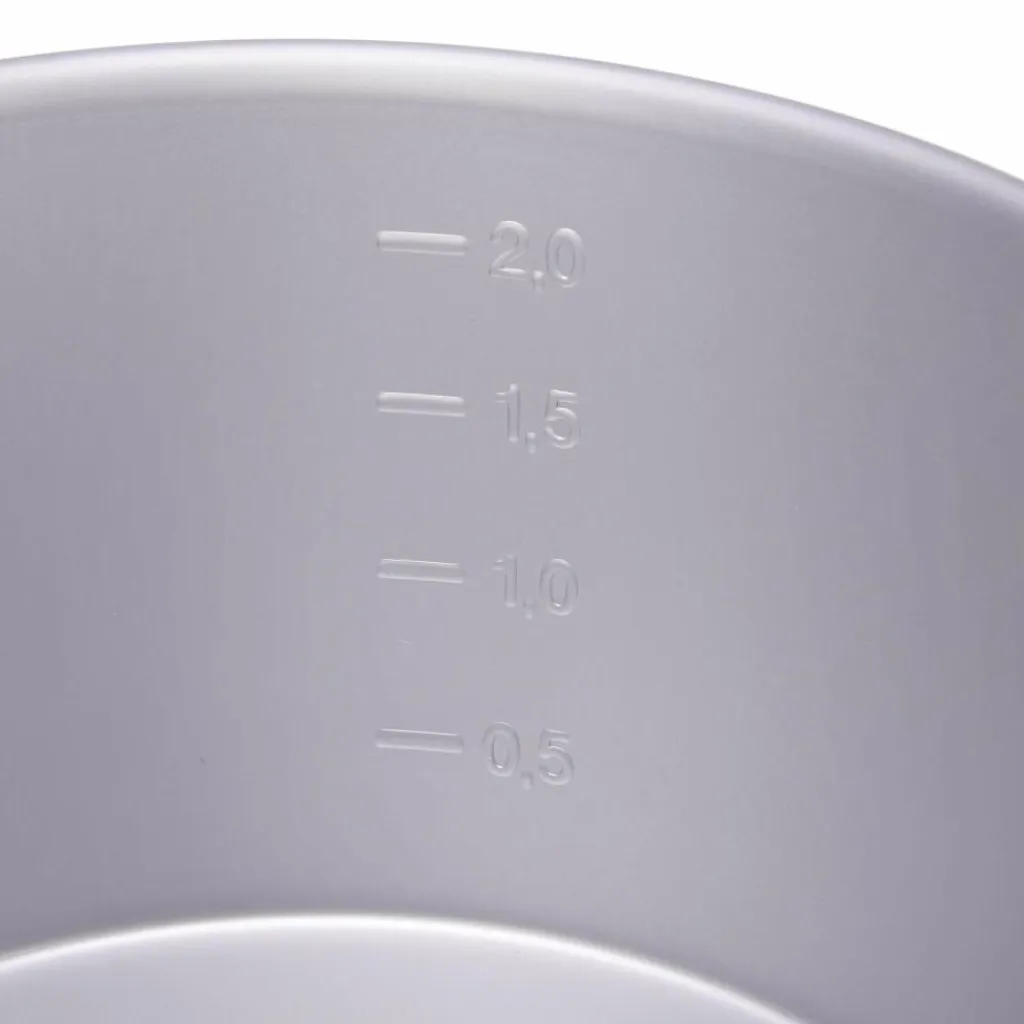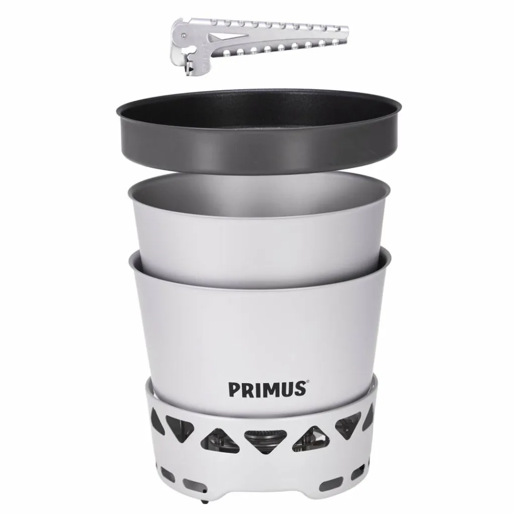 Brennstoffsparendes Kochset für 1-2 Personen. Die beiden 2,3 l Töpfe lassen sich ineinander stapeln und fassen anschließend den Brenner und die Griffzange. So kann alles kompakt verstaut werden.