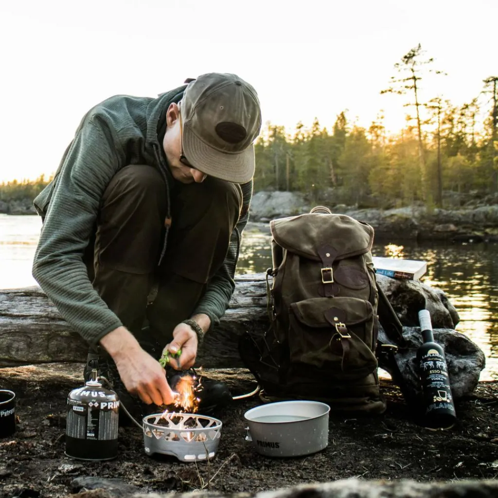 Der Kocher ist im Windschutz integriert und ist somit schnell einsatzbereit. Einfach aufstellen, Gaskartusche anschrauben und los geht das Vergnügen. Auf dem Windschutz stehen die Töpfe sicher und kippstabil.