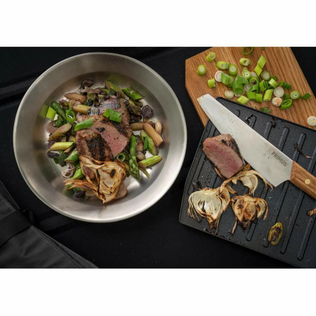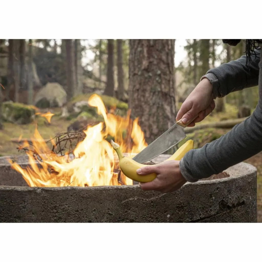Die Edelstahlklinge sitzt fest vernietet am Griff aus Eichenholz, der rutschsicher in der Hand liegt und ein sicheres Führen des Messers ermöglicht. Durch die biegsame Klinge kannst du auch kleinere Filetierarbeiten ausführen. Das macht das Messer auch für geübte Outdoor-Köche zu einem echten Genuss.