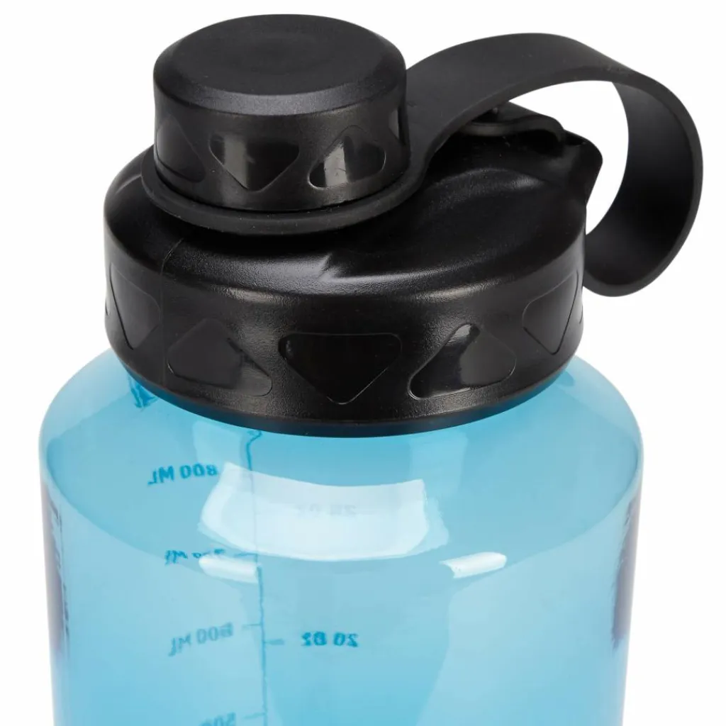Der Trinkverschluss wird mit einer Kappe sicher verscharubt, die zusätzlich am Deckel gegen Verlust gesichert ist. Das Deckelband dient gleichzeitig als Schlaufe, um die Flasche am Rucksack zu befestigen.