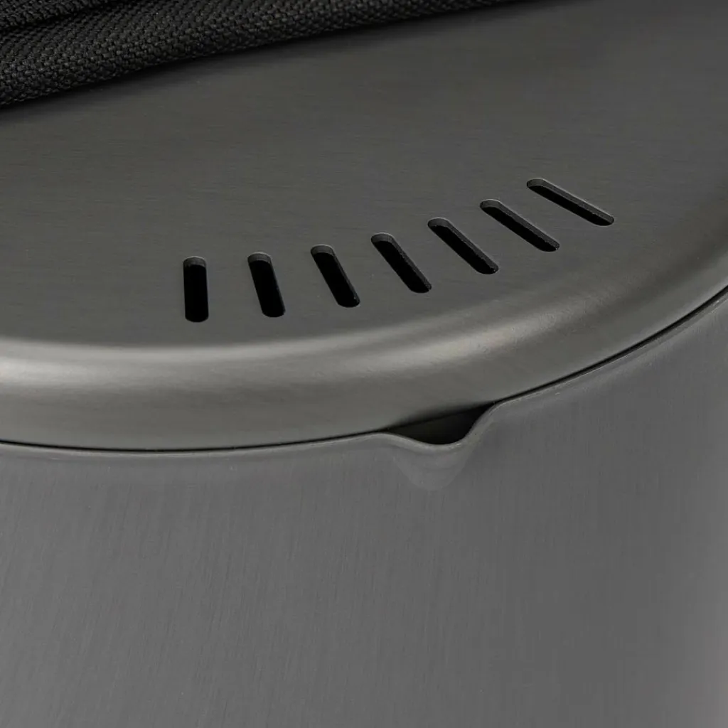 In diesen Topf wurde viel Know-how und Liebe zum Detail gesteckt. Besonders aufwendig gefertigt ist der Topfboden. Das heruntergezogene Design schützt die Flamme vor Wind, und der seitlich angebrachte Wärmetauscher fängt vorbeiströmende Wärme auf und leitet sie an die Topfwand weiter. Das spart Brennstoff, Gewicht im Rucksack und auf Dauer auch Geld im Portemonnaie.