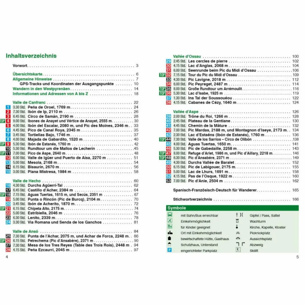 Der Wanderführer bietet eine ausgewogene Mischung aus leichten familiengerechten Wanderungen, mittelschwierigen Halbtageswanderungen und anspruchsvollen Gipfeltouren, die eine gute Kondition und etwas Klettererfahrung voraussetzen. Besonders eindrucksvoll sind die Wanderungen nahe der Grenze, wo die unterschiedlichen Berglandschaften im direkten Kontrast aufeinanderstoßen. Gute Verbindungen erlauben ein bequemes Pendeln zwischen den Pässen von Portalet und Erraize, innerhalb derer sämtliche Wanderungen angesiedelt sind.