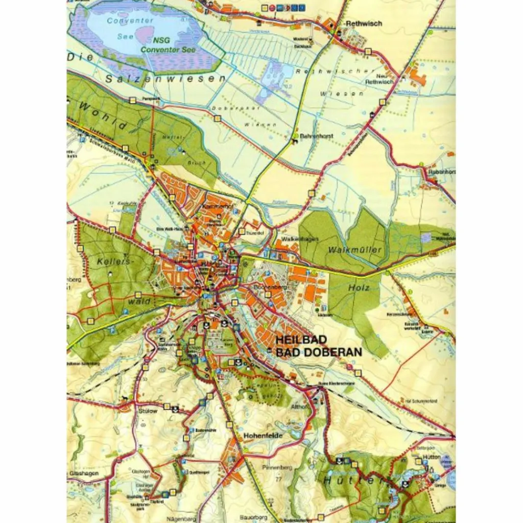 Mittelpunkt der Karte ist das Radwandergebiet rund um Bad Doberan. Sie reicht von Warnemünde im Norden, sowie Rostock im Osten bis nach Kröpelin im Süd-Westen. DIE RAD- & WANDERKARTE wurde nach touristischen, landschaftlichen sowie geographischen Aspekten erarbeitet. Der Maßstab 1:30.000 gibt Raum für eine hohe Genauigkeit und Detailtreue. Die topographische Karte enthält den Verlauf und die Markierungen der ausgewiesenen Wander- und Radwege, Radrouten sowie Angaben zu touristischen Attraktionen und Angeboten.