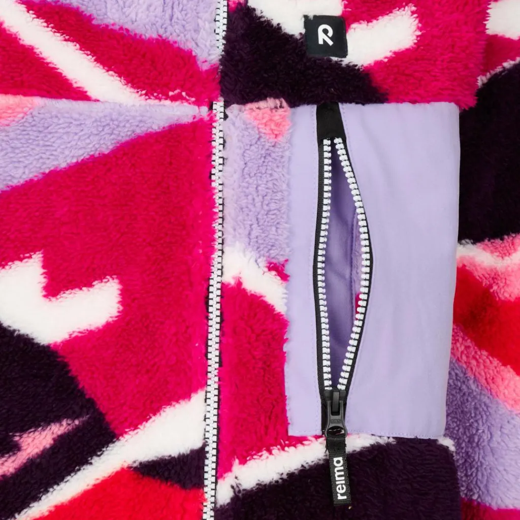 Die Außenseite besteht aus hochflorigem, kuscheligen Teddyfleece. Auf der Innenseite sind die Fasern etwas kürzer und liegen angenehm weich auf der Haut. Das Material speichert die Körperwärme effektiv und sorgt so für wohlige Wärme bei niedrigen Temperaturen. Dank des hohen, flauschigen Kragens bleibt auch der Hals schön warm. Wird die Fleecejacke beim schweißtreibenden Toben oder im leichten Regen einmal feucht, trocknet sie ratzfatz wieder.