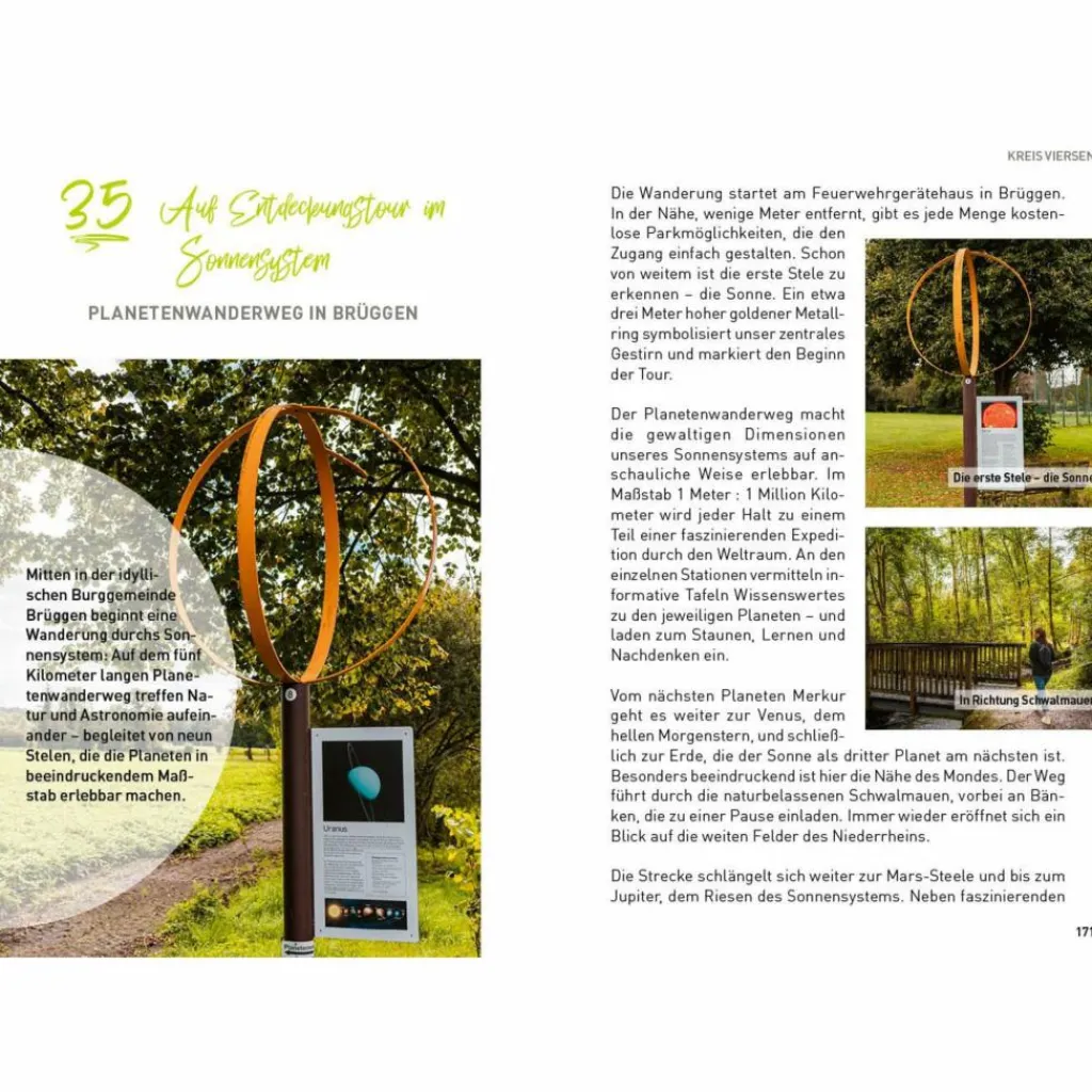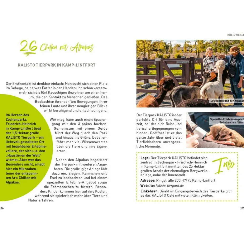 Die Autorin zeigt ihre Lieblingsorte, erzählt Geschichten von heimatverbundenen Menschen und öffnet die Tür zu kulturellen Schätzen, die Geschichte lebendig machen. Die Reise führt so zum beeindruckenden LVR-Archäologischen Park Xanten über den familienfreundlichen Schmugglerpfad in Straelen bis hin zu der außergewöhnlichen Augmented Reality-Radroute „Tim Berresheims Bilderreise“ ab Wassenberg und dem erlebnisreichen Kletterwald Niederrhein in Nettetal. Oder wie wäre es mit ruhigeren Mikroabenteuern wie „Chillen mit Alpakas“ im KALISTO Tierpark in Kamp-Lintfort? Jede Jahreszeit wird zur Bühne für neue Erlebnisse, jedes Kapitel zur Einladung, die eigene Heimat oder die Region neu zu entdecken.