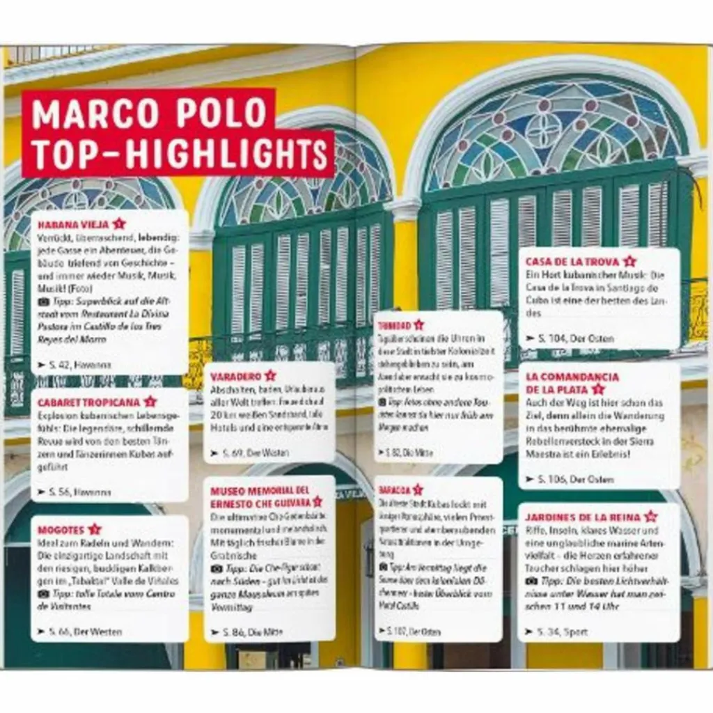 Maximal einfach: Mit den MARCO POLO Erlebnistouren Kuba entdecken Mit dem MARCO POLO Reiseführer Kuba hast du alle Regionen im Überblick: Von Havanna mit seinen kolonialen Prachtbauten zu den Tabakplantagen im Westen, über Abstecher nach Cienfuegos und Trinidad bis in den Osten, wo einst Christoph Kolumbus an Land ging.