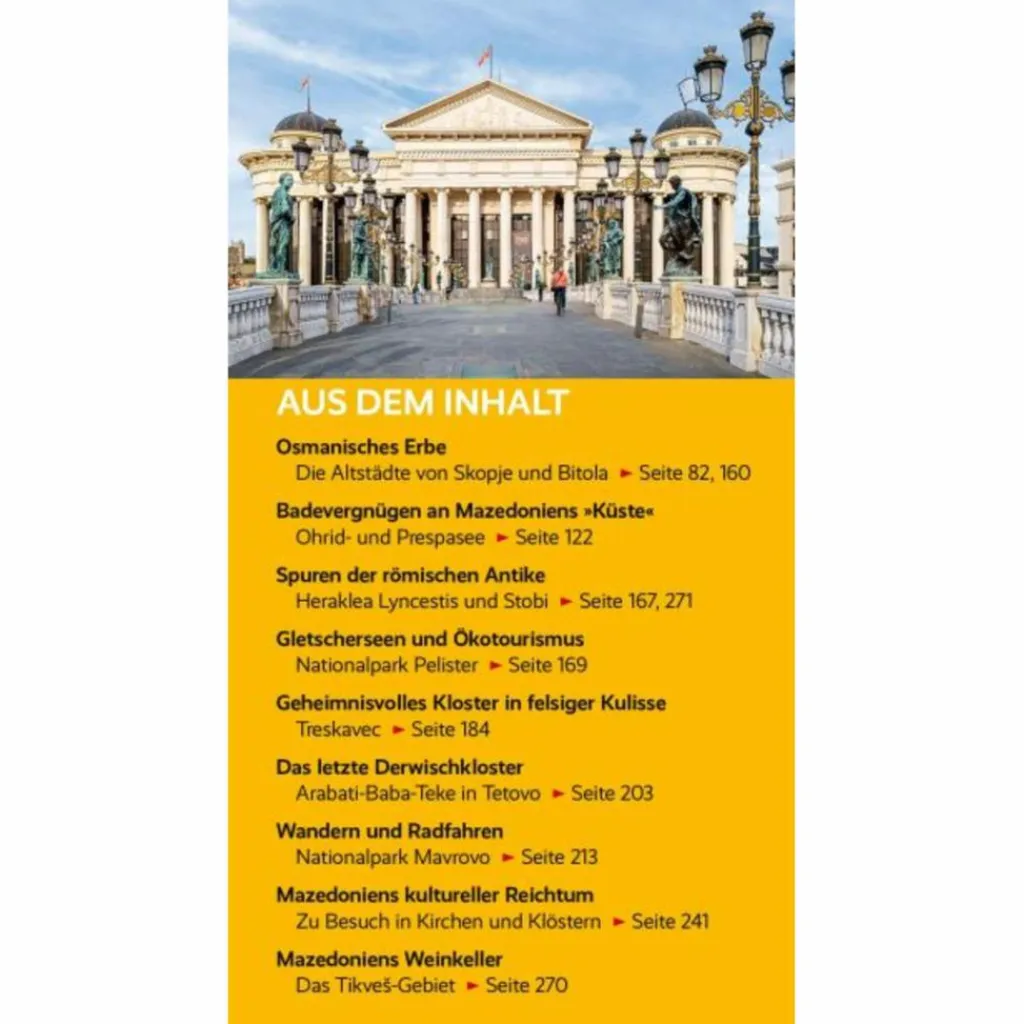 Autor Markus Bingel hat das Land seit seinem ersten Besuch 2012 nicht mehr losgelassen: die mehrtausendjährige Hauptstadt Skopje; aus osmanischer Zeit Bitola mit großen Moscheen und Konsulatsgebäuden; die Welterbe-Stadt Ohrid mit unzähligen mittelalterlichen Kirchen. Malerisch liegt sie am Ohridsee, dem „mazedonischen Meer“. Baden und Bootstouren sind dort ebenso Urlaubsvergnügen wie am benachbarten Prespasee. Paddler geraten bei der Schlucht von Matka ins Schwärmen, durch die man per Boot die Unterwasserhöhle Vrelo erreicht. Im Tikveš-Gebiet heißen Weingüter zur Verkostung des edlen Rebensafts willkommen.