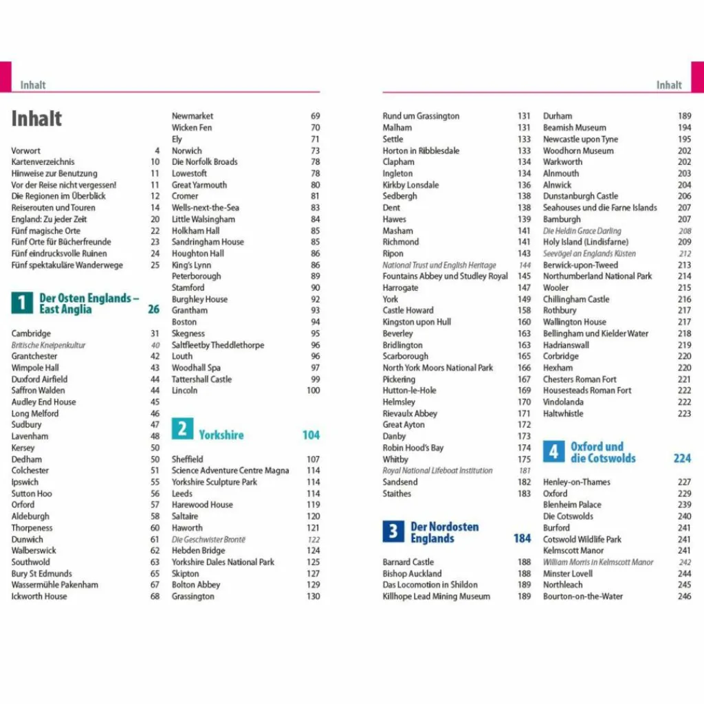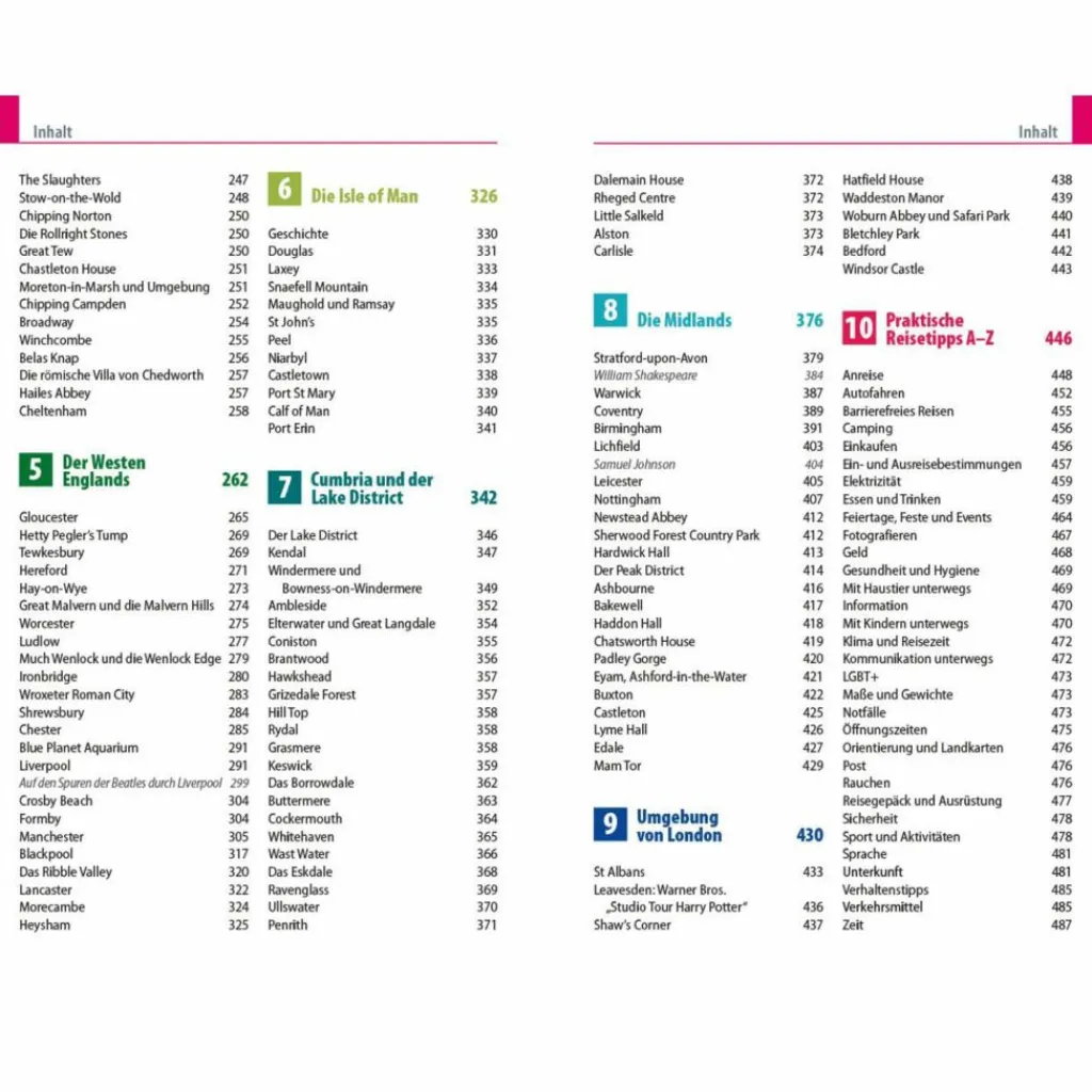 - Übersichtsseiten mit Beschreibungen aller Regionen: Von East Anglia, Yorkshire und dem Nordosten Englands über die Midlands, die Umgebung Londons, Oxford und die Cotswolds bis nach Westen mit Cumbria und dem Lake District und zur Isle of Man