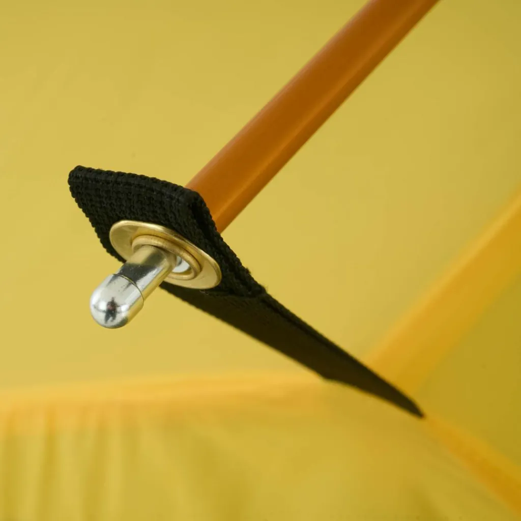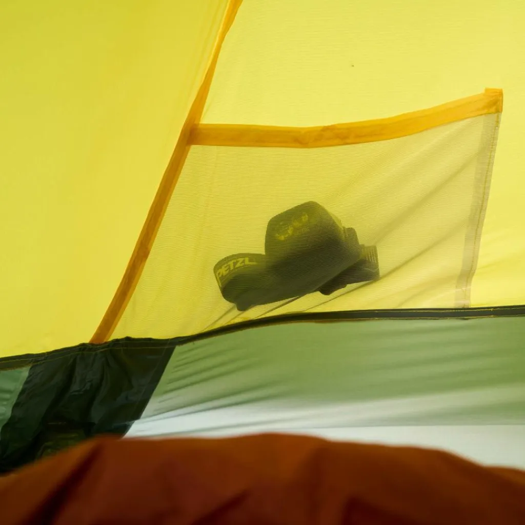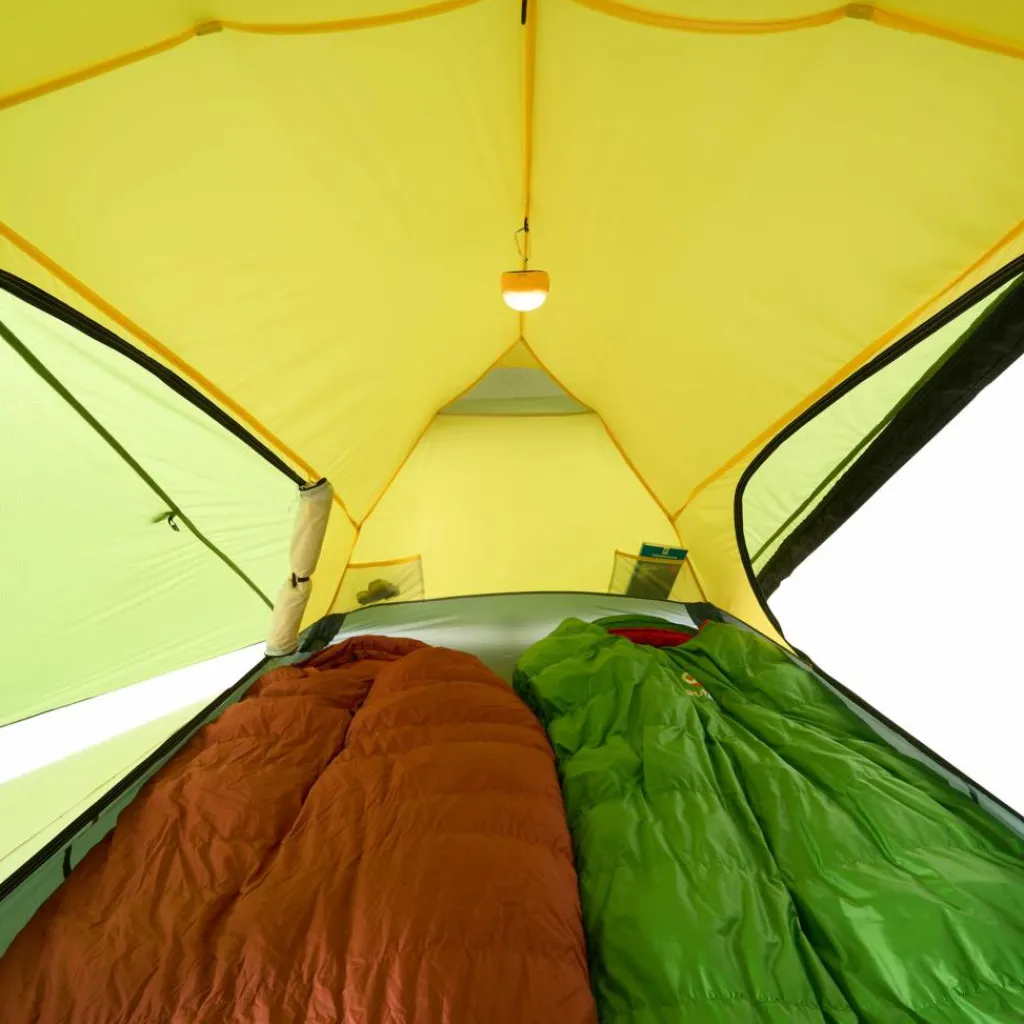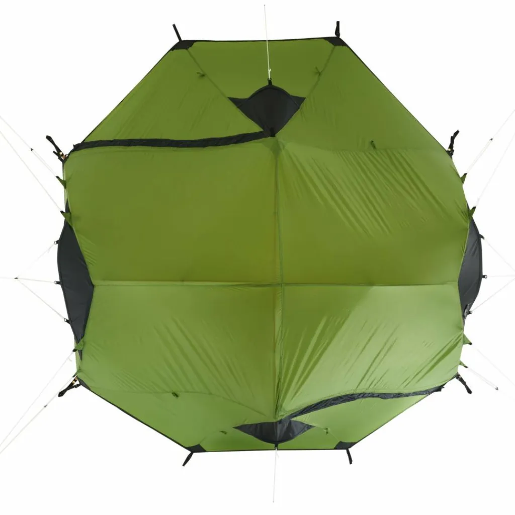 Durch das Gestänge mit hoch angesetzten Kreuzpunkten werden der Fuß- und Kopfbereich weit aufgespannt, was steile Seitenwände erzeugt. Ein zusätzlicher Querbogen im Kuppelbereich spannt das Innenzelt weiter auf und schafft zusätzlichen Platz im Kopfbereich. So bietet das Innenzelt viel Bewegungsfreiheit.