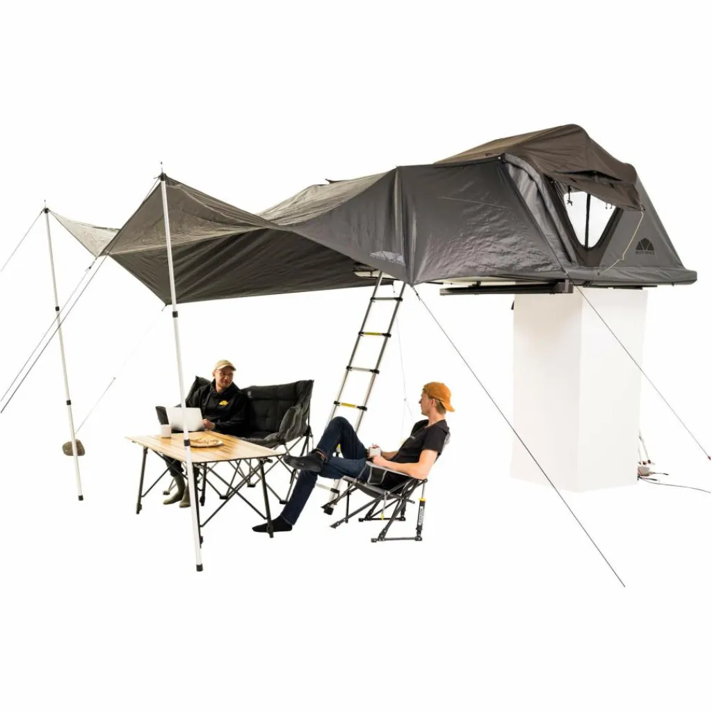 Mit einer Wassersäule von 3.000 mm bietet die Markise zuverlässigen Schutz auch bei Dauerregen. Selbstverständlich ist auch die Verbindung zum Dachzelt wasserdicht. Durch solides Abspannen sowie die Fixierung der Reißverschlüsse am Dachzelt bleibt die Markise auch bei Wind stabil. So kannst du den Ausblick genießen oder dich rundherum vor Regen schützen – je nach Wetterlage.