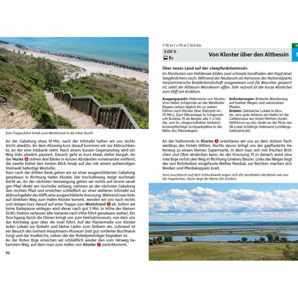 Die meisten Touren sind leicht, viele davon kürzere Halbtageswanderungen, so bleibt ausreichend Zeit für Badespaß. Zwei Nationalparks, ein Biosphärenreservat und etliche Natur- und Vogelschutzgebiete laden zu ausgedehnten Exkursionen ein. Lohnende Wanderziele gibt es mehr als genug, etwa die Feuersteinfelder von Neu Mukran, das windumtoste Kap Arkona oder der Königsstuhl, von dem sich ein spektakuläres Panorama auf die Kreideküste öffnet. Ein Muss ist ein Schiffsausflug auf die autofreie Insel Hiddensee. Auch Hiddensee und Fischland-Darß-Zingst sind mit einigen Touren in diesem Wanderführer vertreten.