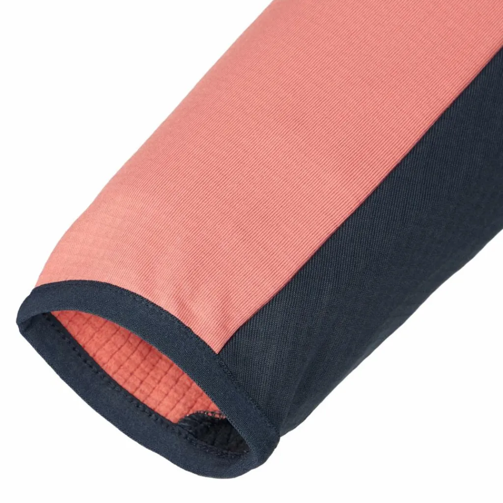 Ein hoher Kragen, elastische Saum- und Ärmelabschlüsse, versetzte Schulternähte sowie zwei Reißverschlusstaschen machen die Jacke zu einem funktionalen Midlayer für den Einsatz am Berg.