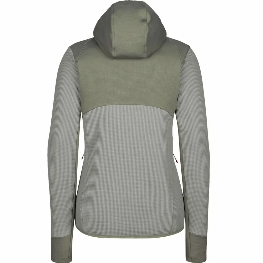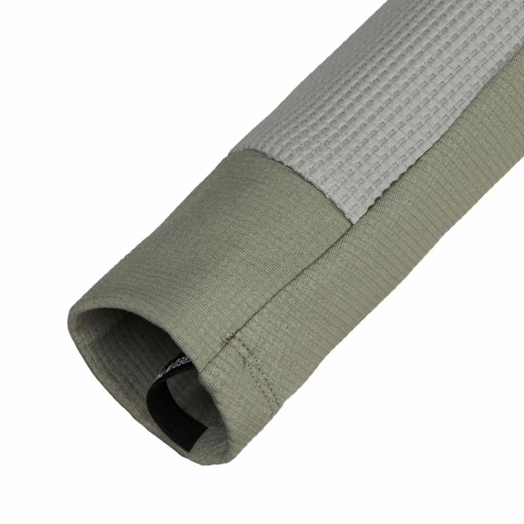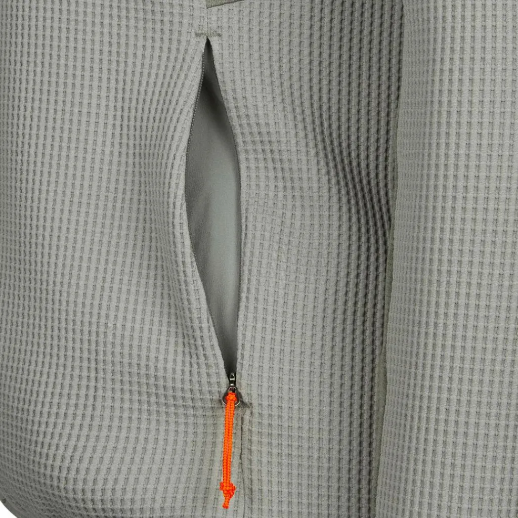 Die Jacke ist aus zwei verschiedenen Polarlite-Materialien gefertigt. Das Hauptmaterial besteht aus Polarlite Waffle, ein robustes Fleece-Material mit einer groben Waffelstruktur. Durch die spezielle Struktur bilden sich Luftkammern, die deine Körperwärme besonders effektiv speichern, ohne dass die Jacke zu schwer wird. Im Brust- und Schulterbereich sowie an der Kapuze und unter den Armen kommt stark elastisches Polarlite Grid zum Einsatz, das dank seiner weich aufgebürsteten Innenseite sehr angenehm auf der Haut liegt. Das Material ist etwas dünner und lässt überschüssige Wärme und Feuchtigkeit zügig entweichen. So hast du es nach hoher körperlicher Belastung schnell wieder schön trocken in der Jacke und kühlst nicht aus, wenn du eine Pause einlegst.