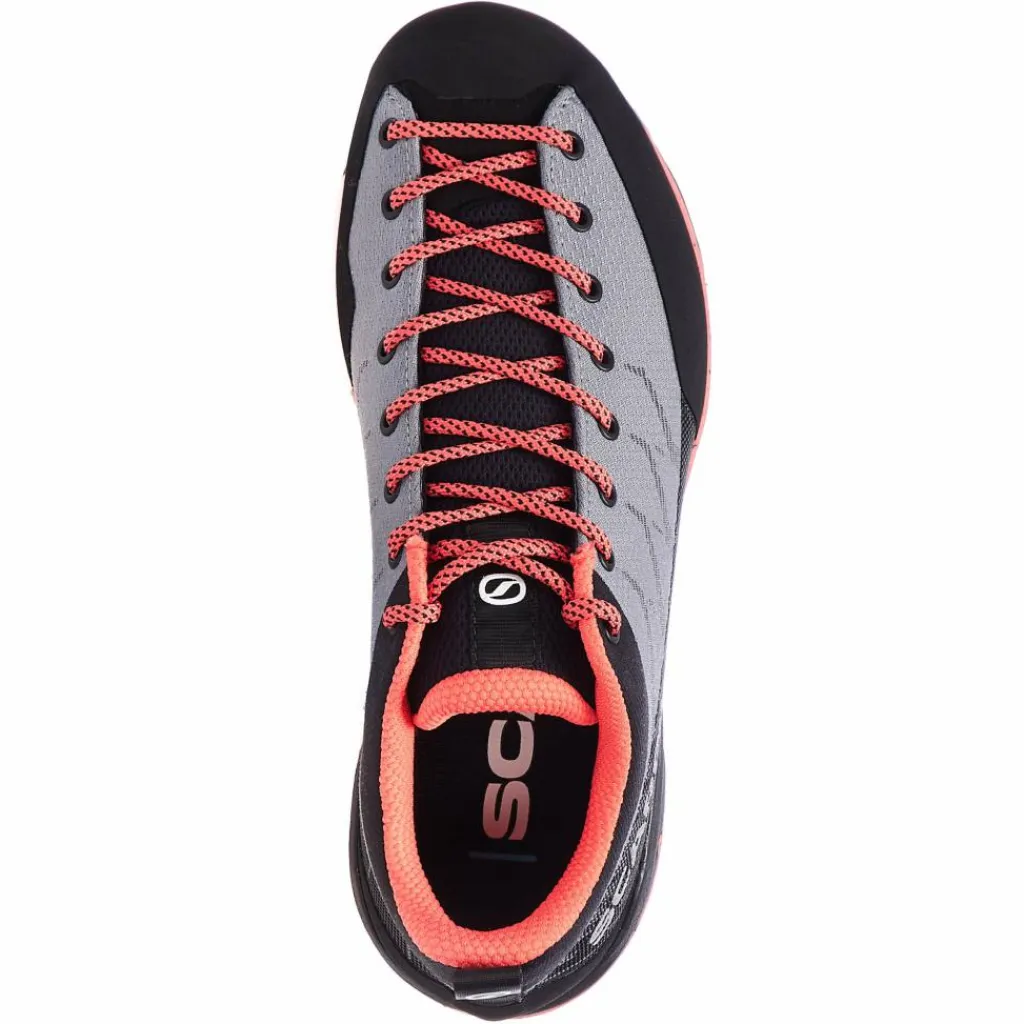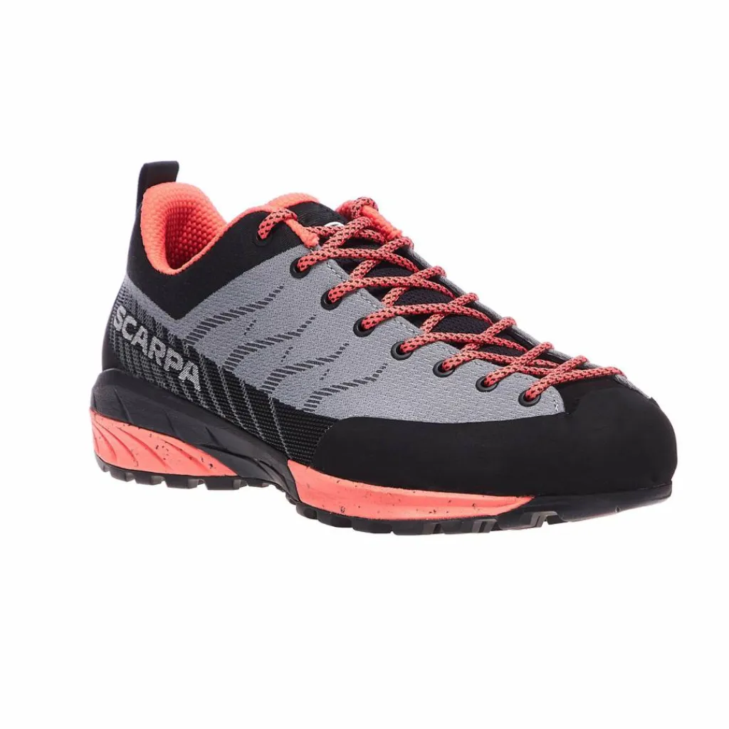 Der robuste Zustiegsschuh verdankt sein geringes Gewicht hauptsächlich dem luftigen Obermaterial. Hier kommt ausschließlich synthetisches Gestrick zum Einsatz, das einen Recyclinganteil von 45% besitzt. Dadurch ist der Zustiegsschuh aber nicht nur schön leicht, er ist außerdem extrem atmungsaktiv. Eignet sich also gerade für sehr kräftezehrende, technische Anstiege, gerade bei besonders warmen Temperaturen und sonnigem Wetter! Er wird ringsherum durch einen robusten Geröllschutzrand sowie eine zusätzliche Gummierung am Vorfuß vor Beschädigung geschützt. Die wie bei einem Kletterschuh weit nach vorne gezogene Schnürung sorgt für ausgezeichnete Anpassung und Präzisen Tritt bis in die Spitze.