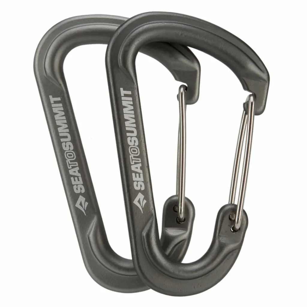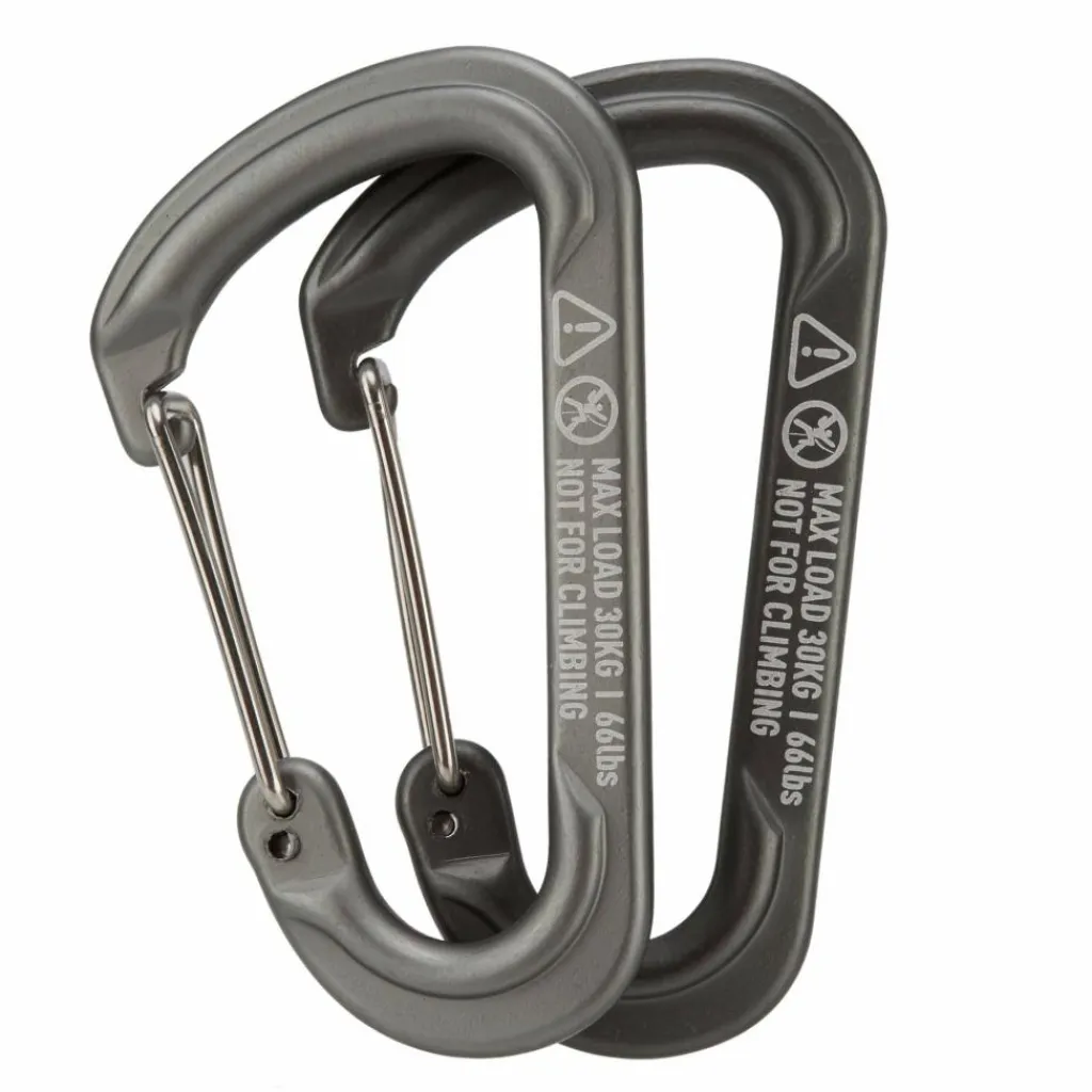 Leichte Materialkarabiner aus eloxiertem Aluminium, die sich zum Sichern von Trinkflaschen und anderer Ausrüstung am Gepäck eignen. Maximal belastbar bis 30 kg.