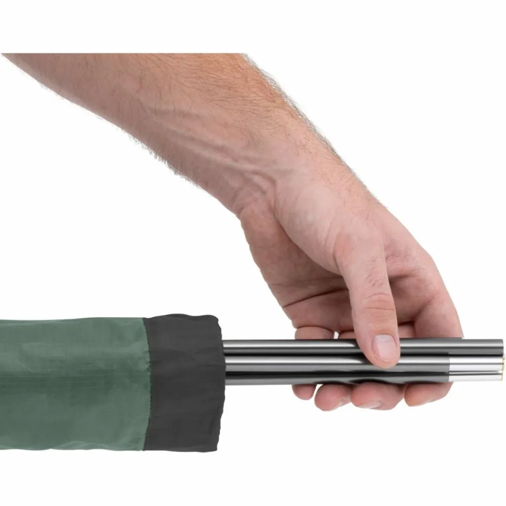 Die Form der Haken erlaubt es zudem, das Gestänge direkt am Außenzelt zu befestigen und dieses ohne Innenzelt zu nutzen. Zwei Hypalon-Schlaufen ermöglichen in dieser Variante das Aufstellen als Unterstand, unter dem mehrere Personen bequem sitzen können. So entsteht eine wetterfeste Unterkunft, in der gemeinsames Abendessen oder geselliges Beisammensein möglich ist. Wenn es Zeit ist, in den Schlafsack zu kriechen, hängst du das Innenzelt ein und klappst das Außenzelt nach unten.