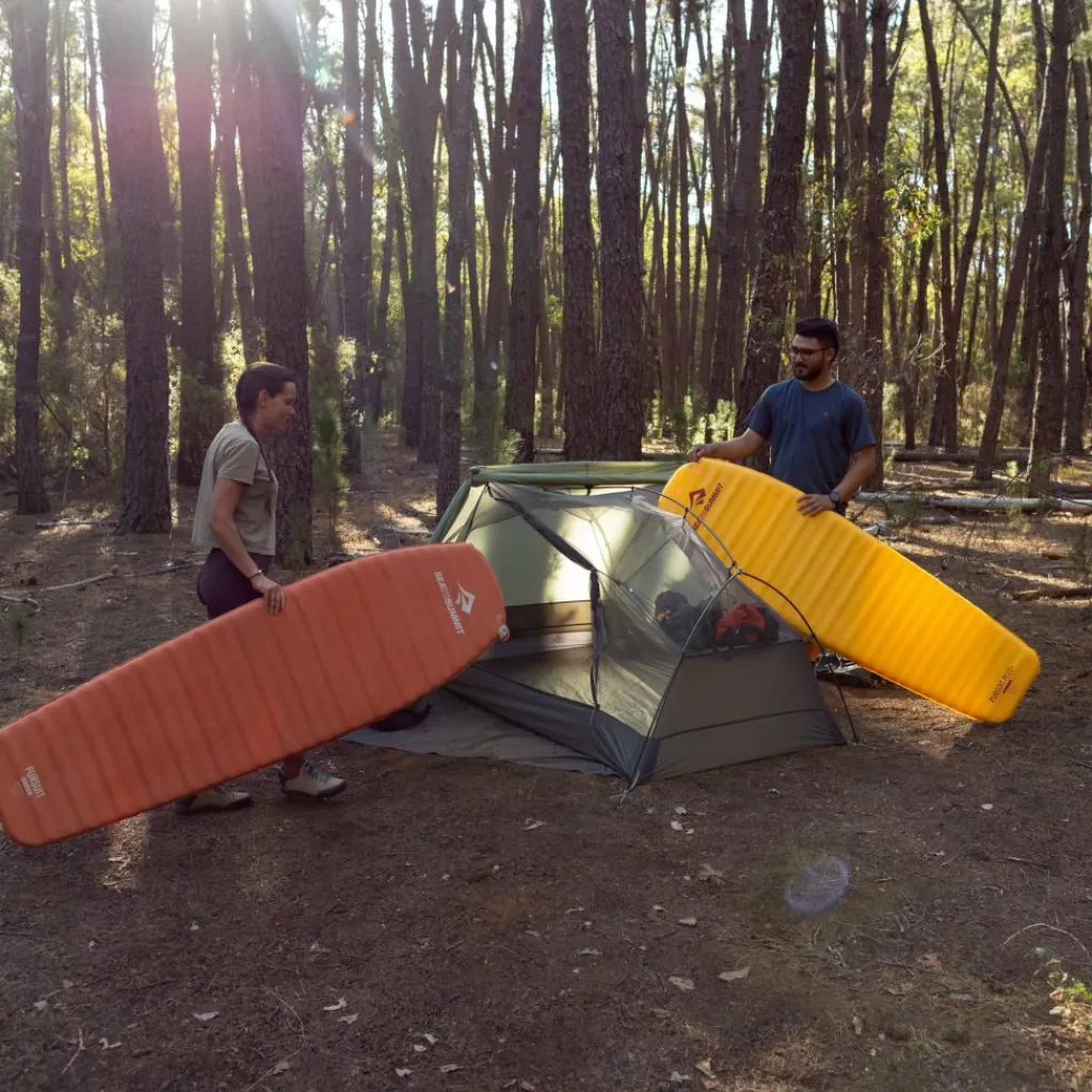 Sea to Summit setzt bei dieser Matte auf Nachhaltigkeit. Das Außenmaterial besteht aus recyceltem Polyester, das spinndrüsengefärbt (Solution Dyed) ist. Dabei werden die Farbpigmente bereits vor der Verarbeitung in die Fasern eingebettet. Das macht die Farben scheuer- und UV-beständig sowie langlebiger als bei klassischen Färbeverfahren. Zudem ist das Verfahren ressourcenschonender, da es weniger Wasser verbraucht.