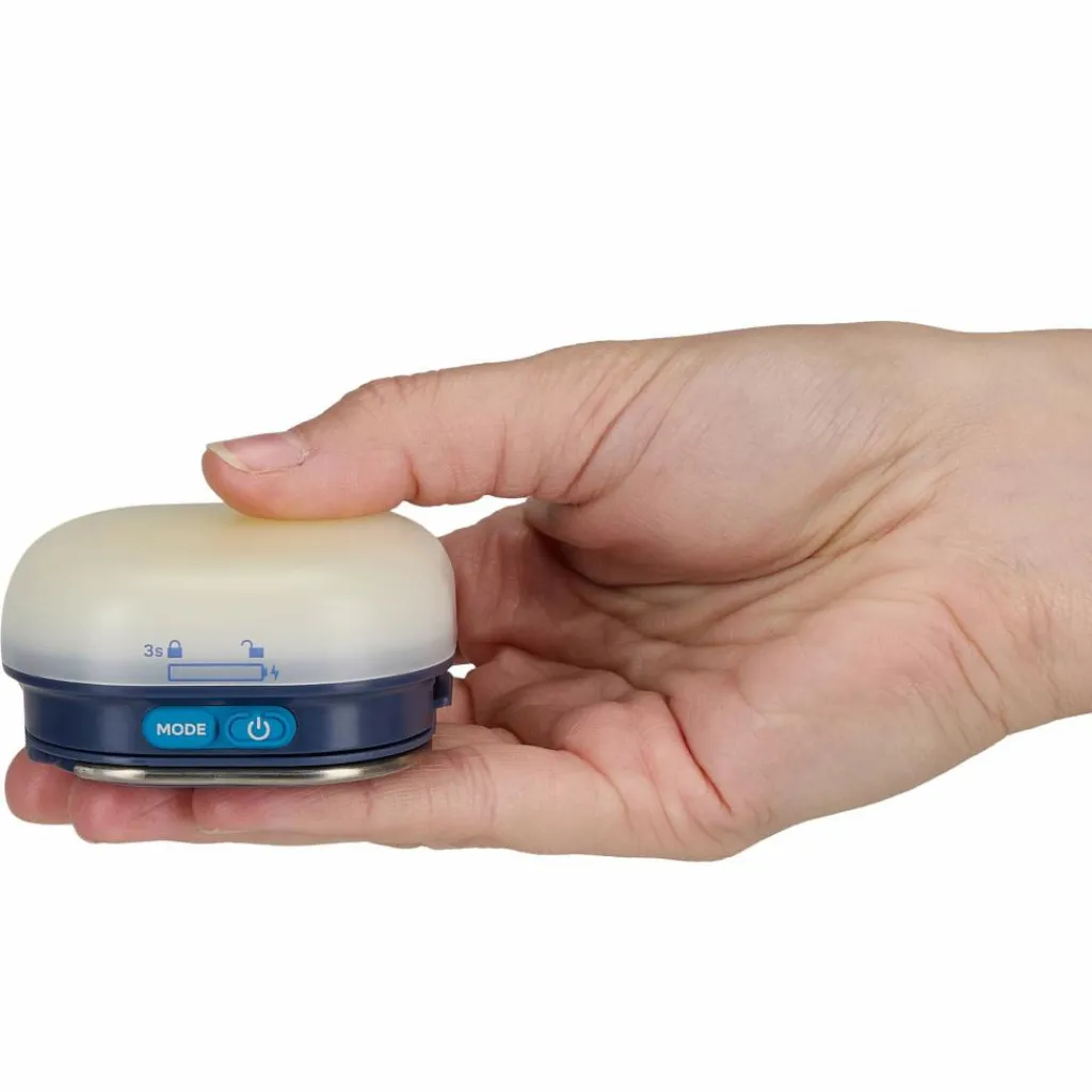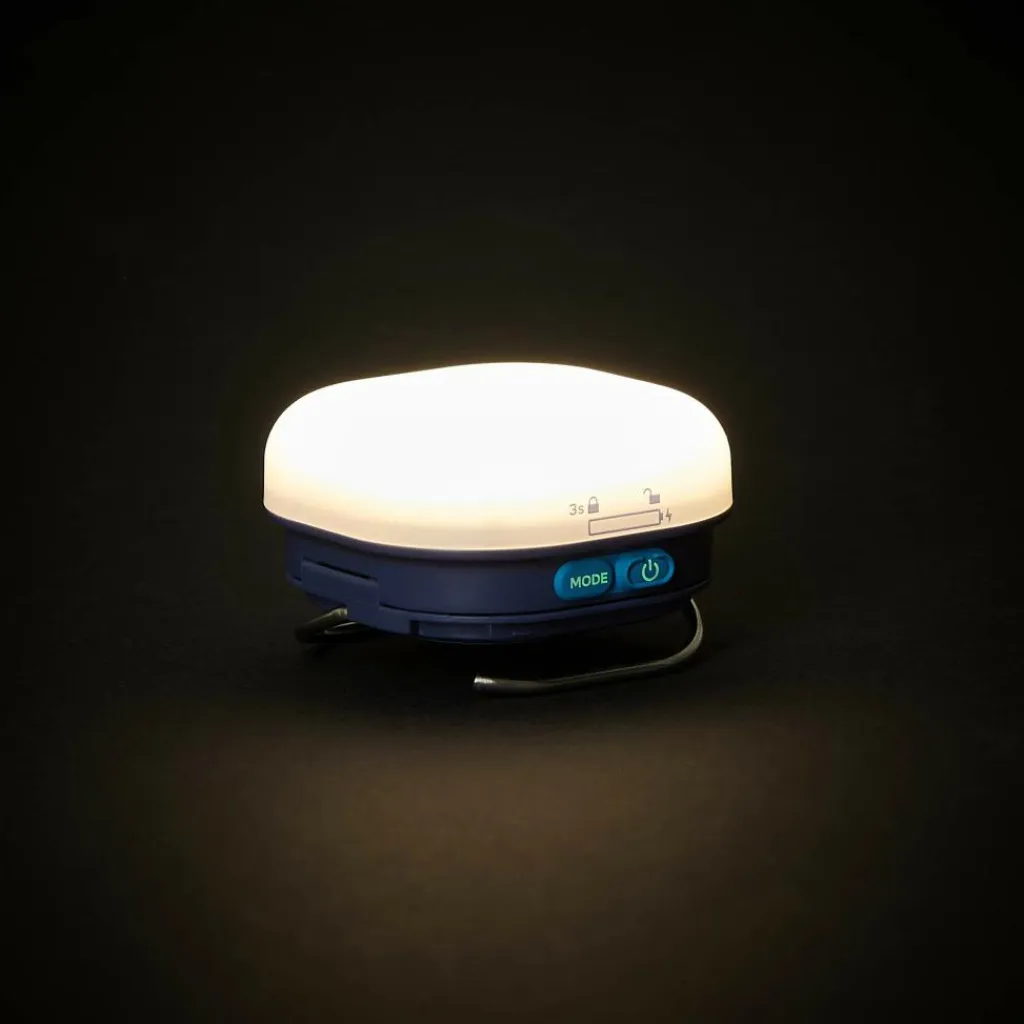 Hergestellt aus recyceltem Kunststoff und ausgestattet mit einem Lampenschirm, der eine breite Ausleuchtung ermöglicht, begleitet dich die Glow auf deinen Trekkingabenteuern. Wähle zwischen kaltweißem Licht zur Orientierung im Camp oder warmweißem Licht, um den Abend stimmungsvoll zu verbringen. Mit drei Helligkeitseinstellungen von 10 bis 250 Lumen kannst du lesen oder dein Zelt vollständig ausleuchten.