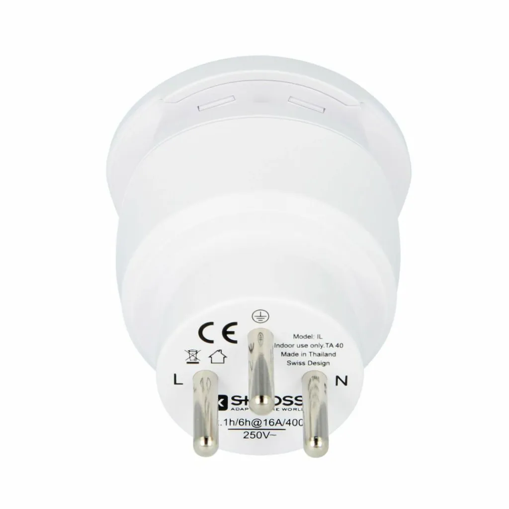 Dieser Reisestecker bietet einen Ausgang für Stecker aus Europa (Schuko) und Israel und ist auch für energieintensive Geräte wie Notebooks und Föns geeignet.