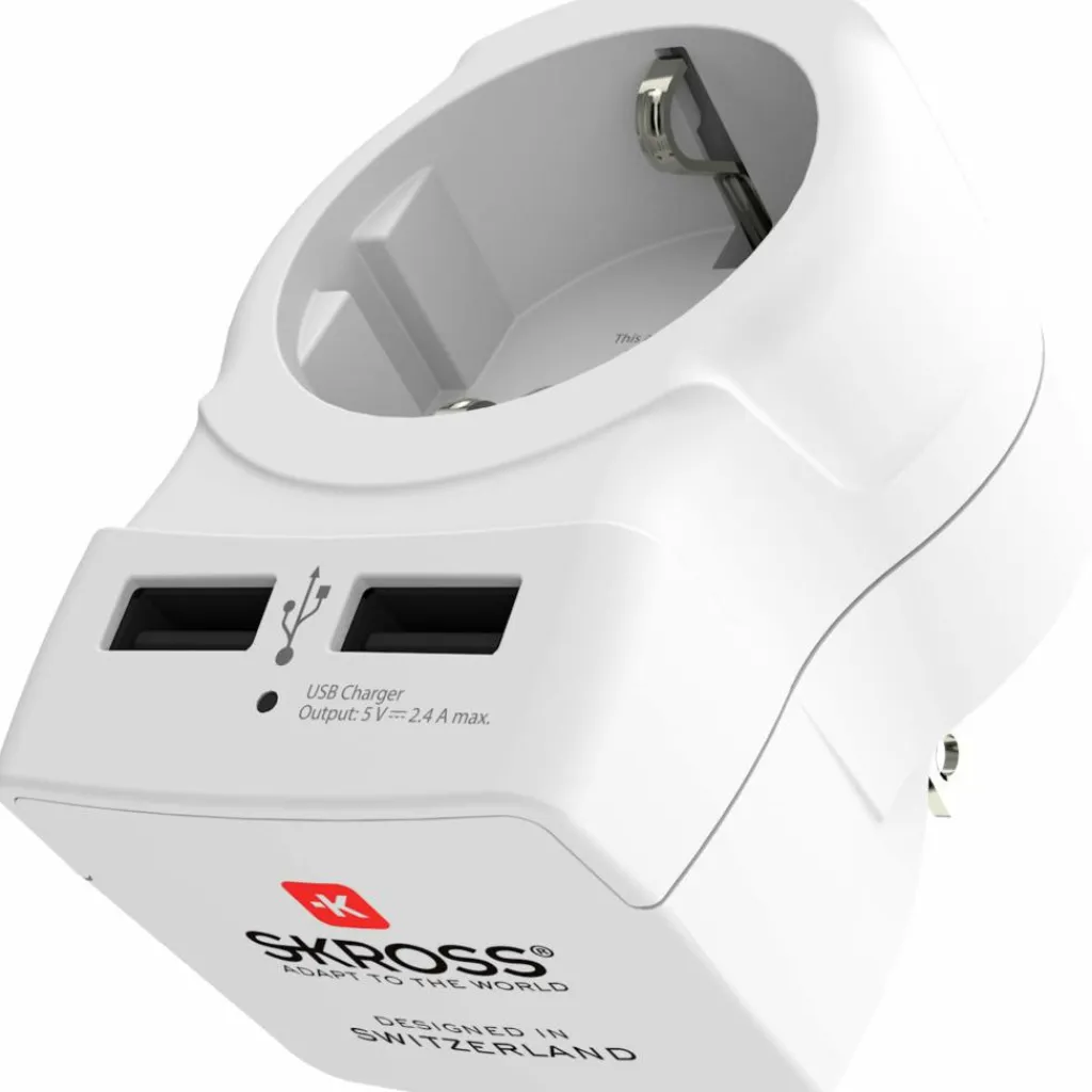 Reisestecker für einen Trip in die Vereinigten Staaten von Amerika und Kanada. Mit Anschlüssen für einen Netzstecker und zwei USB-Geräte. So sind Notebook, Kamera und Smartphone schnell geladen.