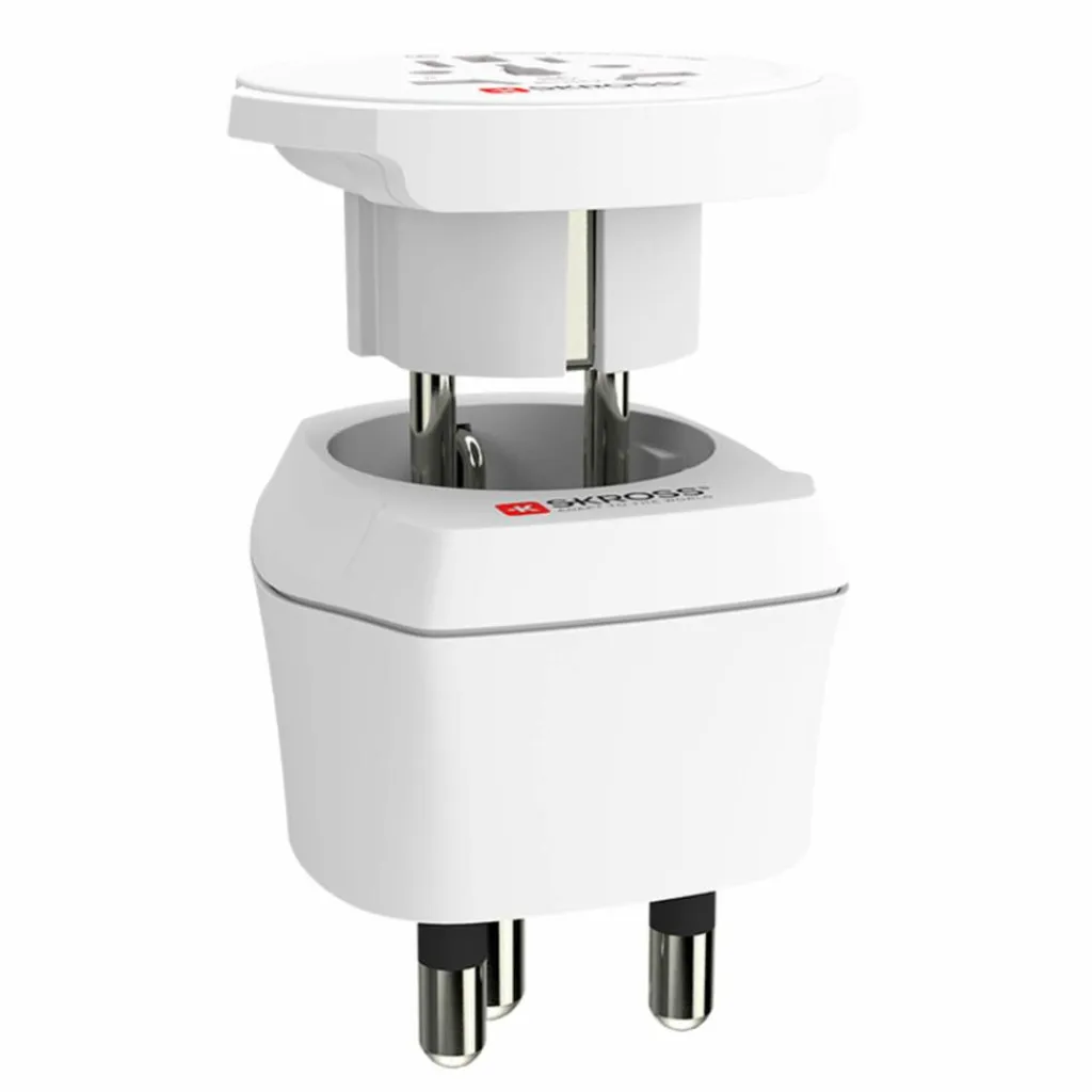 Reisestecker für Reisen nach Südafrika und alle Länder mit Schuko-Standard. Der Einsatz erlaubt das Anschließen unterschiedlicher Steckertypen weltweit.