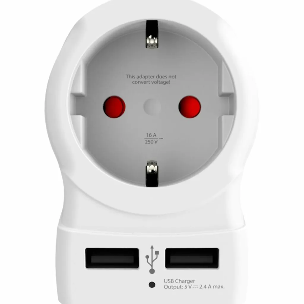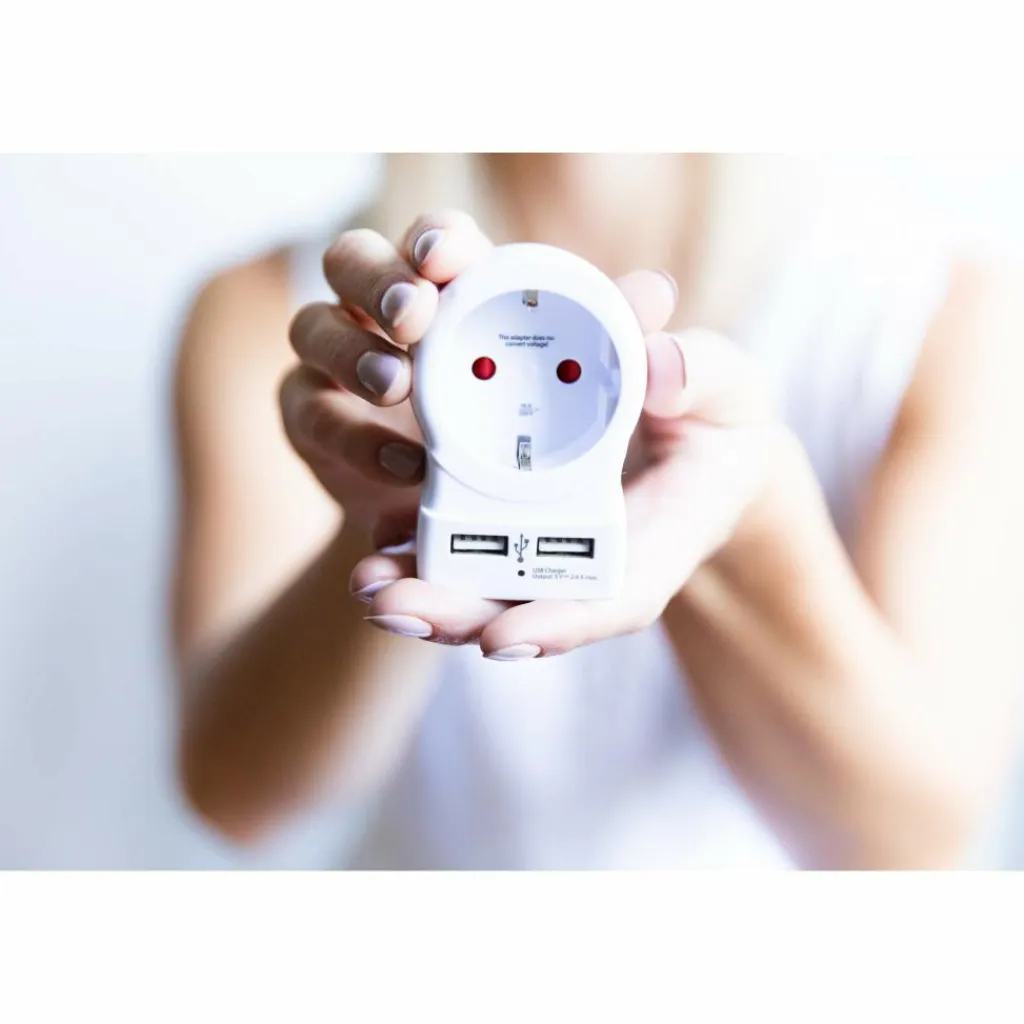 Reisestecker für einen Trip ins Vereinigte Königreich. Mit Anschlüssen für einen Netzstecker und zwei USB-Geräte. So sind Notebook, Kamera und Smartphone schnell geladen.