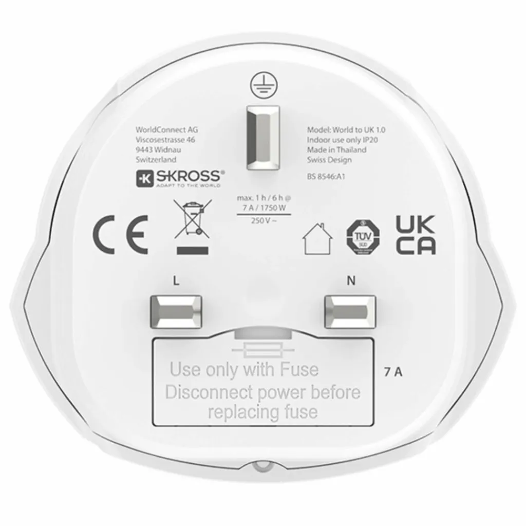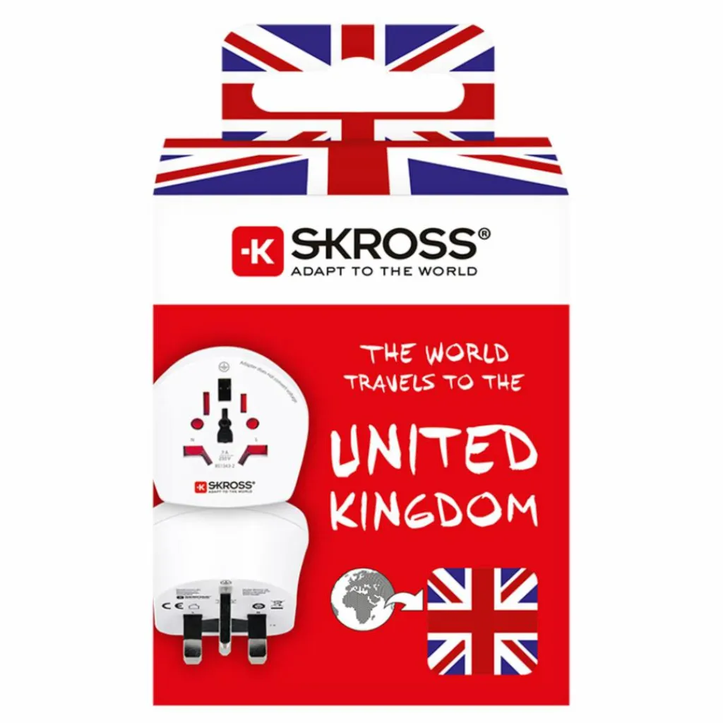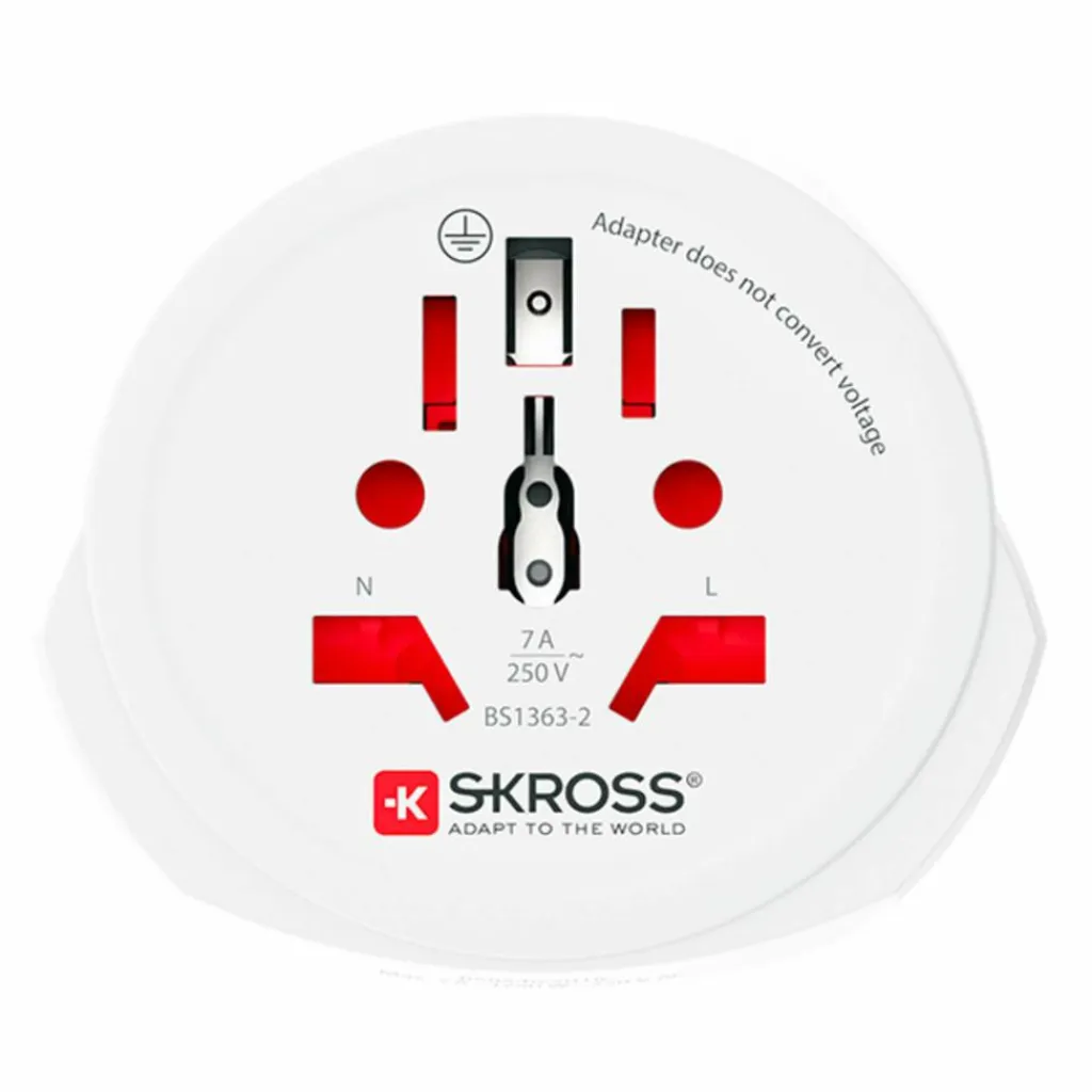 Reisestecker für Reisen nach Großbritannien und alle Länder mit UK-Standard. Der Einsatz erlaubt das Anschließen unterschiedlicher Steckertypen weltweit.
