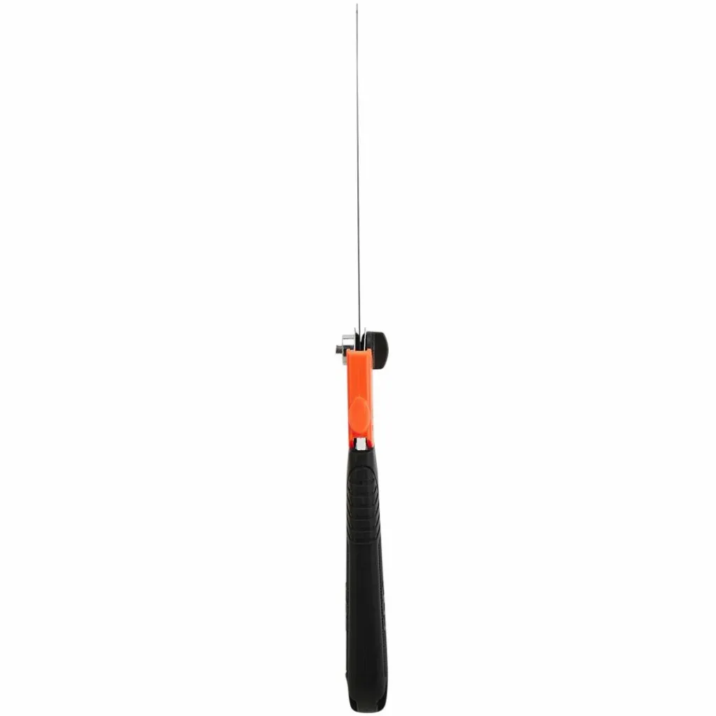 Die Säge ist am Griffrücken mit einer Sicherung ausgestattet, die das Aus- oder Einklappen der Klinge erst nach dem Drücken ermöglicht. Wird die Klinge ausgeklappt, arretiert sie automatisch, um beste Sicherheit während der Arbeit zu gewährleisten. Der große Kunststoffgriff ist mit rutschfesten Querrillen versehen und am Ende mit einer Fangriemenöse ausgestattet. Dadurch kannst du eine Kordel zur zusätzlichen Sicherung anknoten.