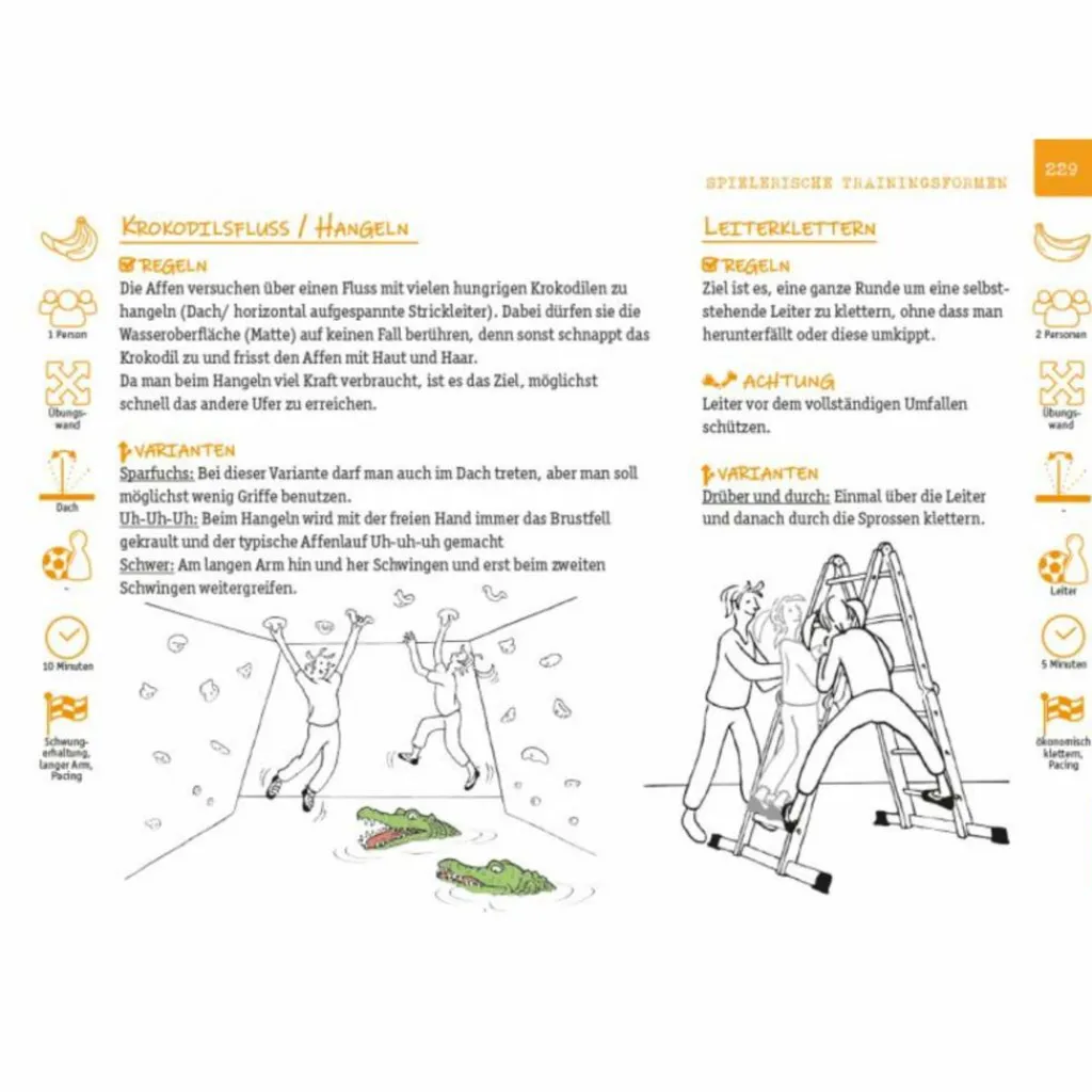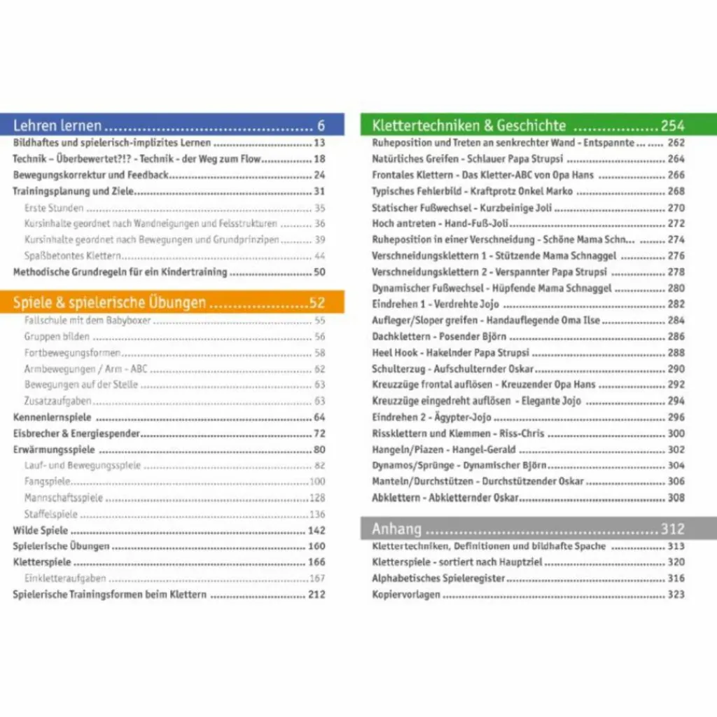 Übungen und Spiele sind thematisch geordnet und durch Inhaltsverzeichnis und Glossar trainingsspezifisch nachschlag- und anwendbar. Mit der Geschichte der Affenfamilie Schimpanski können Kinder- und Jugendtrainer ihre Schützlinge motivieren und die einzelnen Klettertechniken Comic-und Story-gestützt vermitteln.