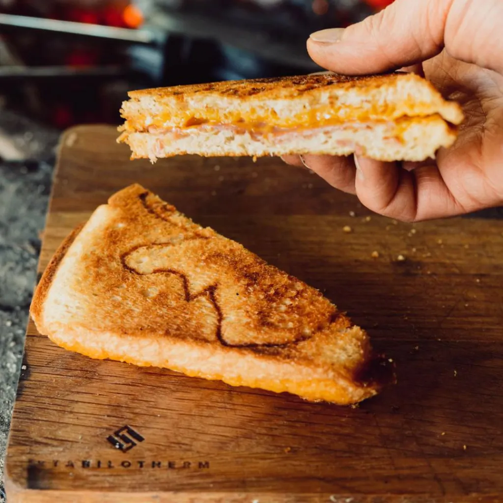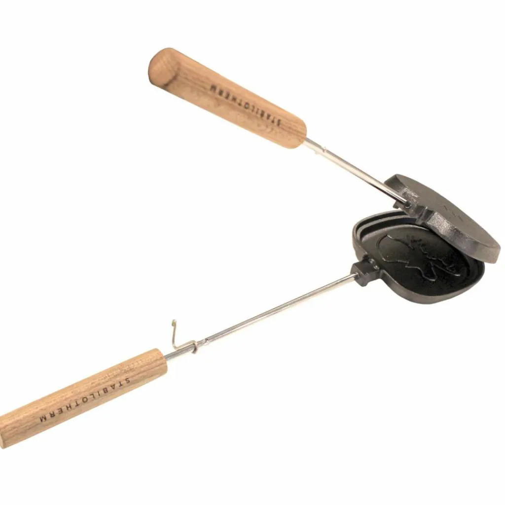 Der Sandwichmaker aus Stahl eignet sich für hohe Temperaturen und bereitet leckere Sandwiches direkt auf dem Lagerfeuer zu. Verziert wird das Sandwich mit einem Elchmotiv!