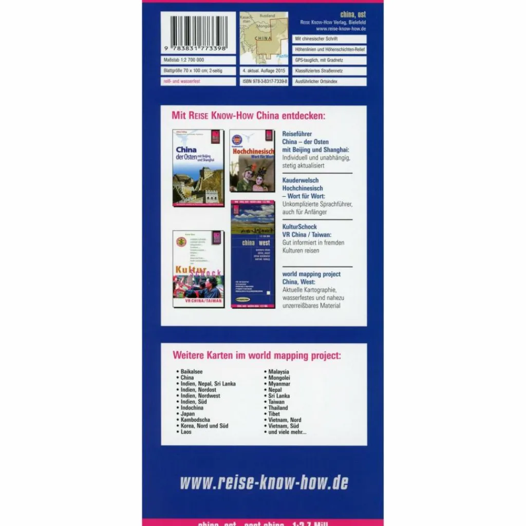 Hochreißfeste und 100% wasserfeste Landkarte „China, Ost“ aus der Serie world mapping project, erschienen im Reise Know-How Verlag.Reise Know-How Landkarten zeichnen sich durch besonders stabiles Kunststoffpapier aus, das beschreibbar ist wie Papier, sogar mit Bleistift. Der Pappumschlag ist abnehmbar, so dass sich die Karte bequem in jede Tasche stecken lässt. Eine Schutzhülle ist nicht erforderlich. Die kartografische Darstellung konzentriert sich auf die wichtigsten Informationen für Reisende und ist besonders gut lesbar. Statt einer Schummerung werden farbige Höhenschichten verwendet.Ausstattung: – Höhenlinien mit Höhenangaben; – Farbige Höhenschichten; – Klassifiziertes Straßennetz mit Entfernungsangaben; – Sehenswürdigkeiten; – Ausführlicher Ortsindex; – GPS-genau; – Längen- und Breitengrade; – Fünfsprachige Legende (deutsch, englisch, französisch, spanisch, russisch); – Größere Orte auch in chinesischer Schrift; – Die Karte umfasst auch Taiwan, Nord- und Südkorea komplett. Handliches Format: 70×100 cm, 2-seitig bedruckt.